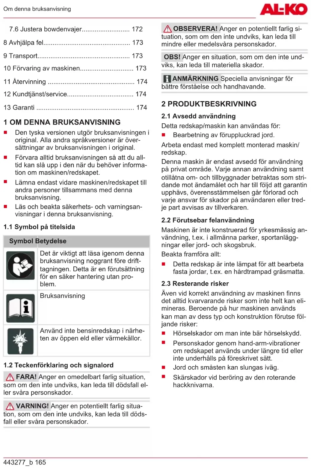 Bearbetning av föruppluckrad jord. Arbeta endast med komplett monterad maskin/ redskap. Denna maskin är endast avsedd för användning på privat område. Varje annan användning samt otillåtna om- och tillbyggnader betraktas som stri- dande mot ändamålet och har till följd att garantin upphävs, överensstämmelsen går förlorad och varje ansvar för skador på användaren eller tred- je part avvisas av tillverkaren.