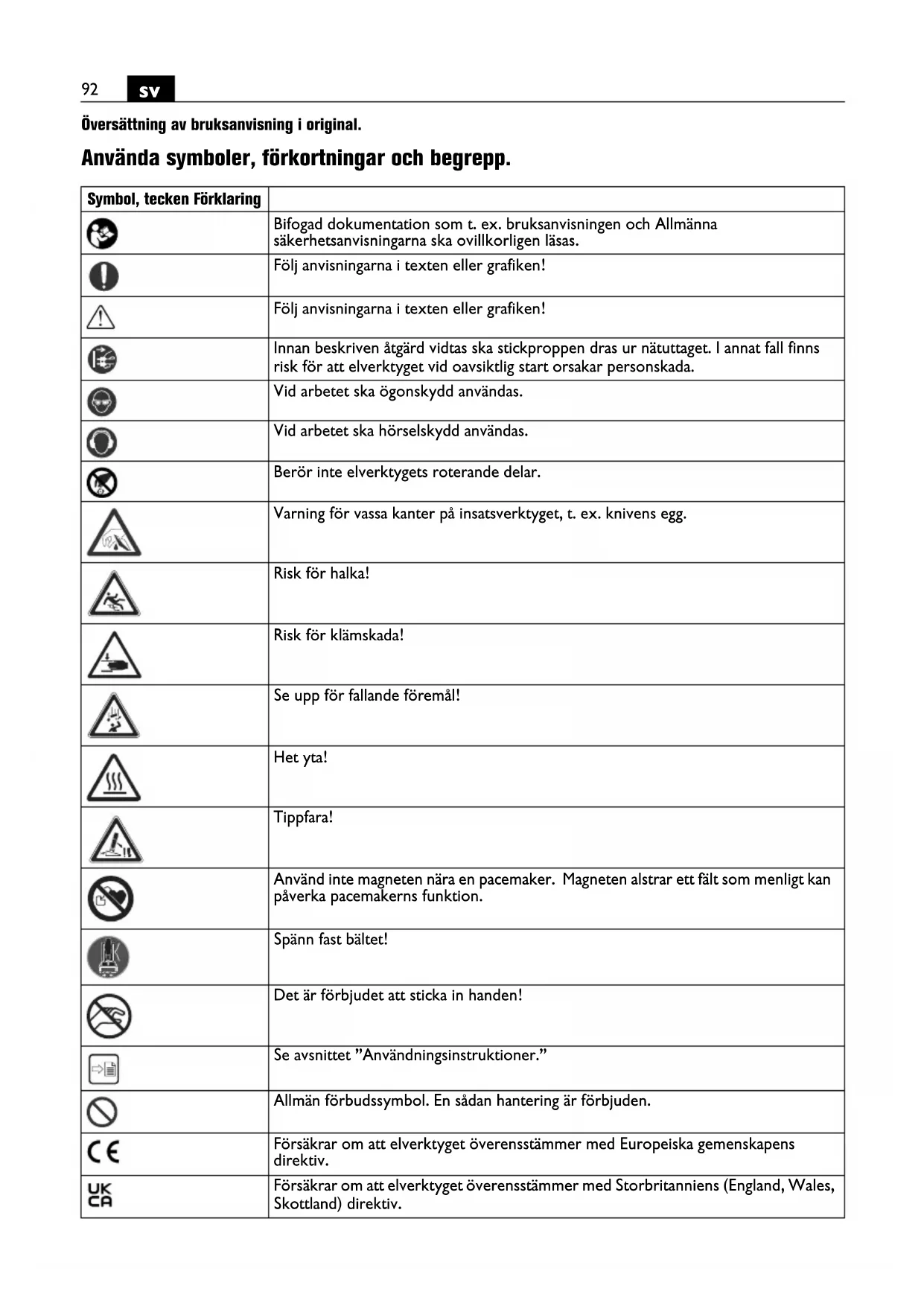 Översättning av bruksanvisning i original. Använda symboler, förkortningar och begrepp. Symbol, tecken Förklaring Bifogad dokumentation som t. ex. bruksanvisningen och Allmänna säkerhetsanvisningarna ska ovillkorligen läsas. Följ anvisningarna i texten eller grafiken! Följ anvisningarna i texten eller grafiken! Innan beskriven åtgärd vidtas ska stickproppen dras ur nätuttaget. I annat fall finns risk för att elverktyget vid oavsiktlig start orsakar personskada. Vid arbetet ska ögonskydd användas. Vid arbetet ska hörselskydd användas. Berör inte elverktygets roterande delar. Varning för vassa kanter på insatsverktyget, t. ex. knivens egg. Risk för halka! Risk för klämskada! Se upp för fallande föremål! Het yta! Tippfara! Använd inte magneten nära en pacemaker. Magneten alstrar ett fält som menligt kan påverka pacemakerns funktion. Spänn fast bältet! Det är förbjudet att sticka in handen! Se avsnittet ”Användningsinstruktioner.” Allmän förbudssymbol. En sådan hantering är förbjuden. Försäkrar om att elverktyget överensstämmer med Europeiska gemenskapens direktiv. Försäkrar om att elverktyget överensstämmer med Storbritanniens (England, Wales, Skottland) direktiv.93