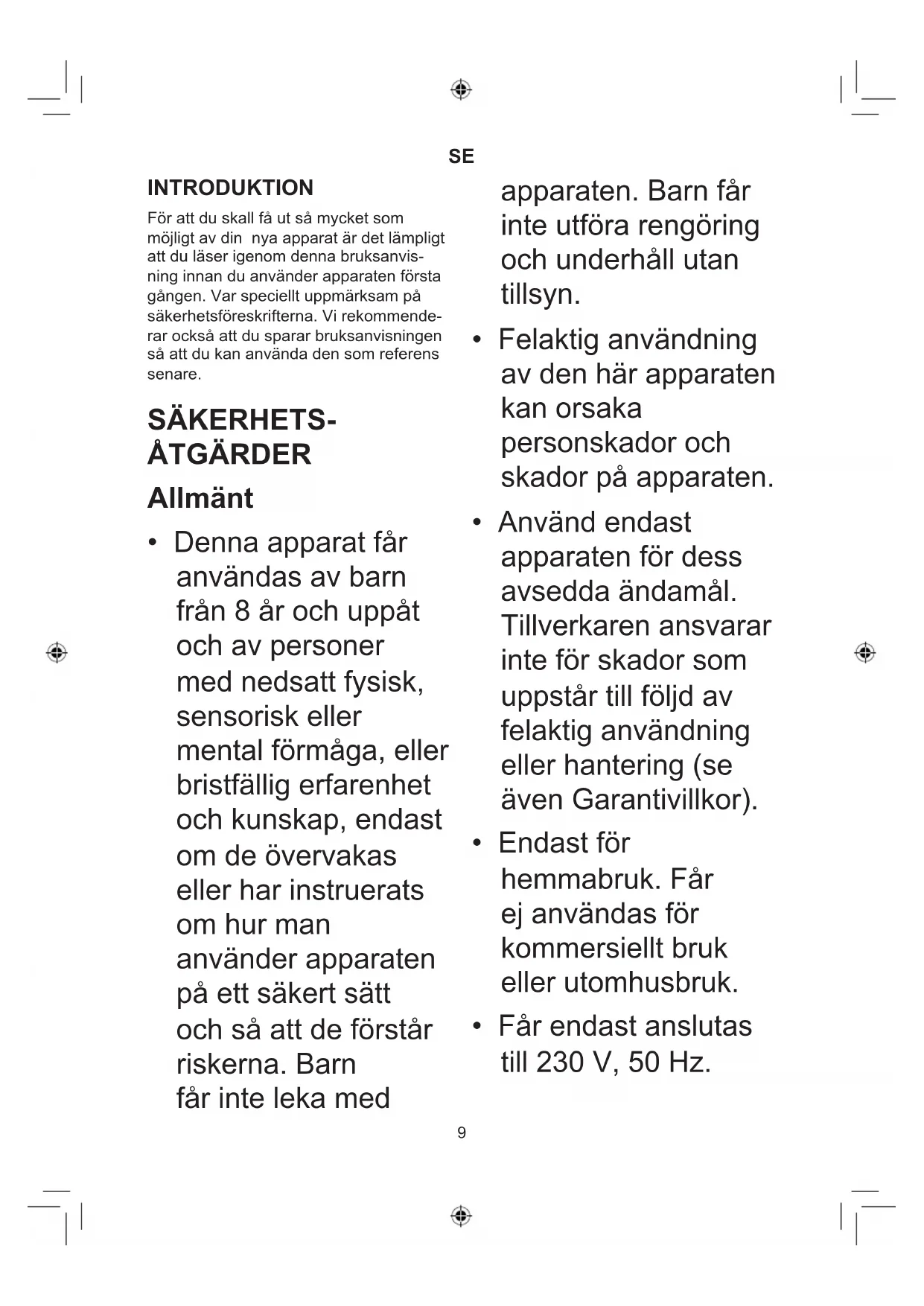 INTRODUKTION För att du skall få ut så mycket som möjligt av din nya apparat är det lämpligt att du läser igenom denna bruksanvis- ning innan du använder apparaten första gången. Var speciellt uppmärksam på säkerhetsföreskrifterna. Vi rekommende- rar också att du sparar bruksanvisningen så att du kan använda den som referens senare. SÄKERHETS- ÅTGÄRDER Allmänt