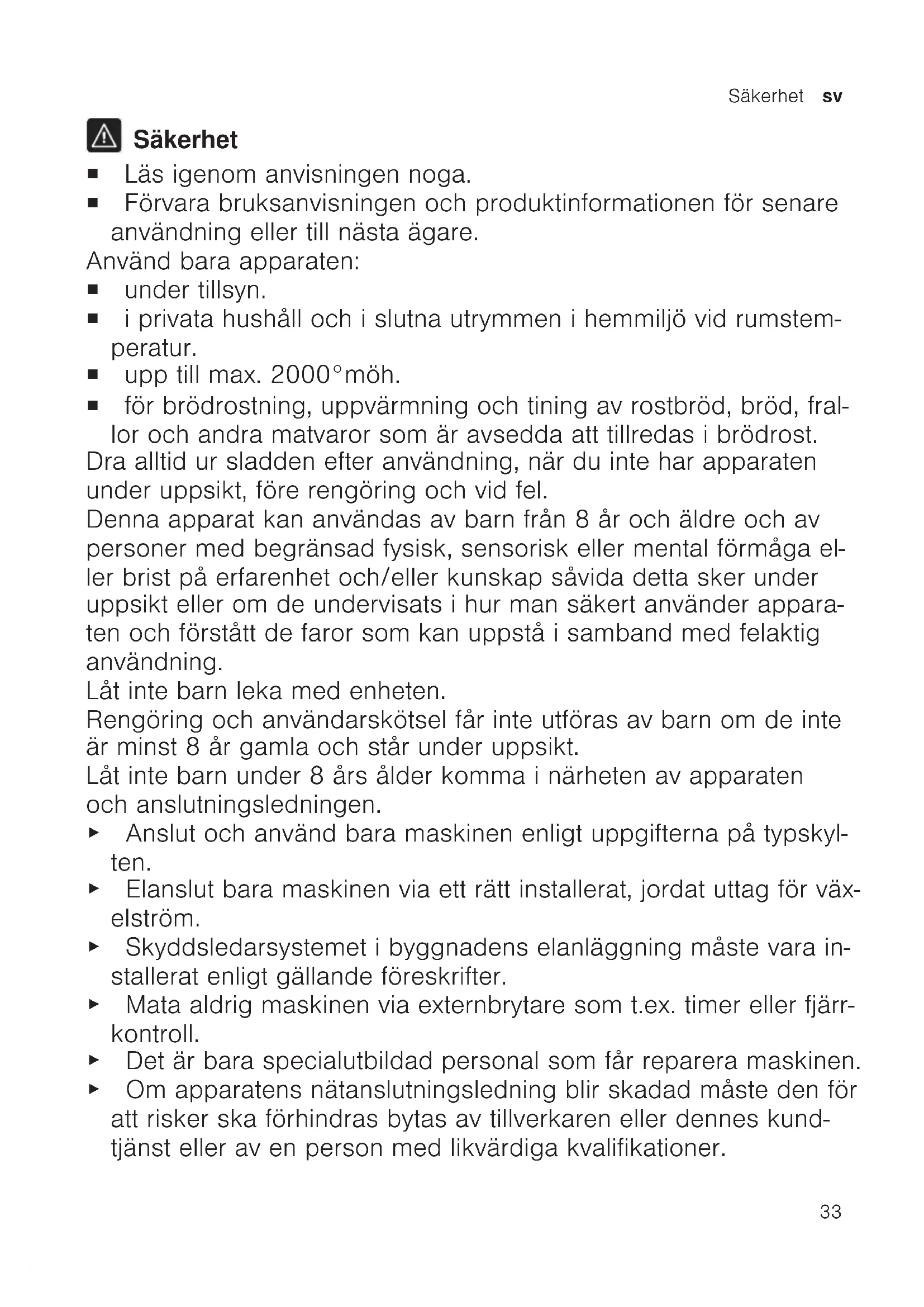 Säkerhet ¡ Läs igenom anvisningen noga. ¡ Förvara bruksanvisningen och produktinformationen för senare användning eller till nästa ägare. Använd bara apparaten: ¡ under tillsyn. ¡ i privata hushåll och i slutna utrymmen i hemmiljö vid rumstem- peratur. ¡ upp till max. 2000°möh. ¡ för brödrostning, uppvärmning och tining av rostbröd, bröd, fral- lor och andra matvaror som är avsedda att tillredas i brödrost. Dra alltid ur sladden efter användning, när du inte har apparaten under uppsikt, före rengöring och vid fel. Denna apparat kan användas av barn från 8år och äldre och av personer med begränsad fysisk, sensorisk eller mental förmåga el- ler brist på erfarenhet och/eller kunskap såvida detta sker under uppsikt eller om de undervisats i hur man säkert använder appara- ten och förstått de faror som kan uppstå i samband med felaktig användning. Låt inte barn leka med enheten. Rengöring och användarskötsel får inte utföras av barn om de inte är minst 8år gamla och står under uppsikt. Låt inte barn under 8års ålder komma i närheten av apparaten och anslutningsledningen. ▶ Anslut och använd bara maskinen enligt uppgifterna på typskyl- ten. ▶ Elanslut bara maskinen via ett rätt installerat, jordat uttag för väx- elström. ▶ Skyddsledarsystemet i byggnadens elanläggning måste vara in- stallerat enligt gällande föreskrifter. ▶ Mata aldrig maskinen via externbrytare som t.ex. timer eller fjärr- kontroll. ▶ Det är bara specialutbildad personal som får reparera maskinen. ▶ Om apparatens nätanslutningsledning blir skadad måste den för att risker ska förhindras bytas av tillverkaren eller dennes kund- tjänst eller av en person med likvärdiga kvalifikationer.sv Översikt