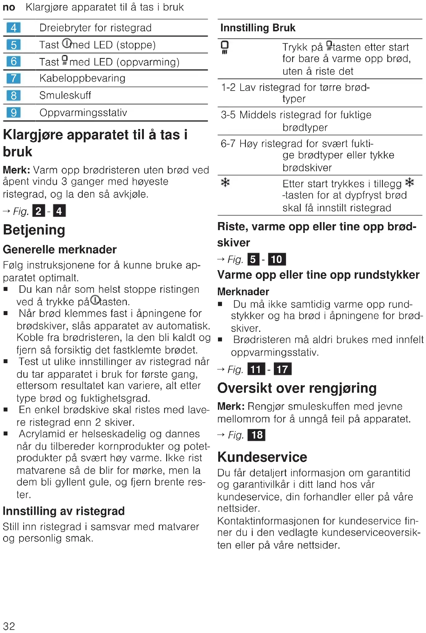 - Fig. 2 - 4 Användning Allmänna anvisningar Följ anvisningarna, så använder du appara- ten optimalt. ¡ Du kan när som helst stoppa aktuell rost- ning genom att trycka på knappen . ¡ Om bröd fastnar i rostningsöppningarna stänger apparaten av sig själv. Dra ut kontakten till brödrosten, låt brödrosten svalna och ta sedan försiktigt bort brödet som fastnat. ¡ Prova olika rostningsgradsinställningar när du använder apparaten första gång- en. Resultatet kan variera allt efter bröds- ort och fuktighetsgrad. ¡ Rosta en enkel brödskiva med lägre rostningsgrad än 2 skivor. ¡ Akrylamid är hälsofarligt och uppstår när du tillagar gryn- och potatisprodukter på väldigt hög värme. Rosta inga livsmedel för mycket, utan gyllenbruna och ta även bort brända rester. Rostningsgradsinställning Ställ in rostningsgraden allt efter livsmedel och personlig smak. Inställning Användning Om brödet bara ska värmas upp utan att rostas, tryck på knappen efter start 1-2 Lägre rostningsgrad för torra brödsorter 3-5 Medelhög rostningsgrad för fuktiga brödsorter 6-7 Hög rostningsgrad för myck- et fuktiga brödsorter eller tjocka brödskivor Tryck en gång till på knap- pen efter start så att djup- fryst bröd får inställd rost- ningsgrad Rosta, värma upp eller tina brödski- vor