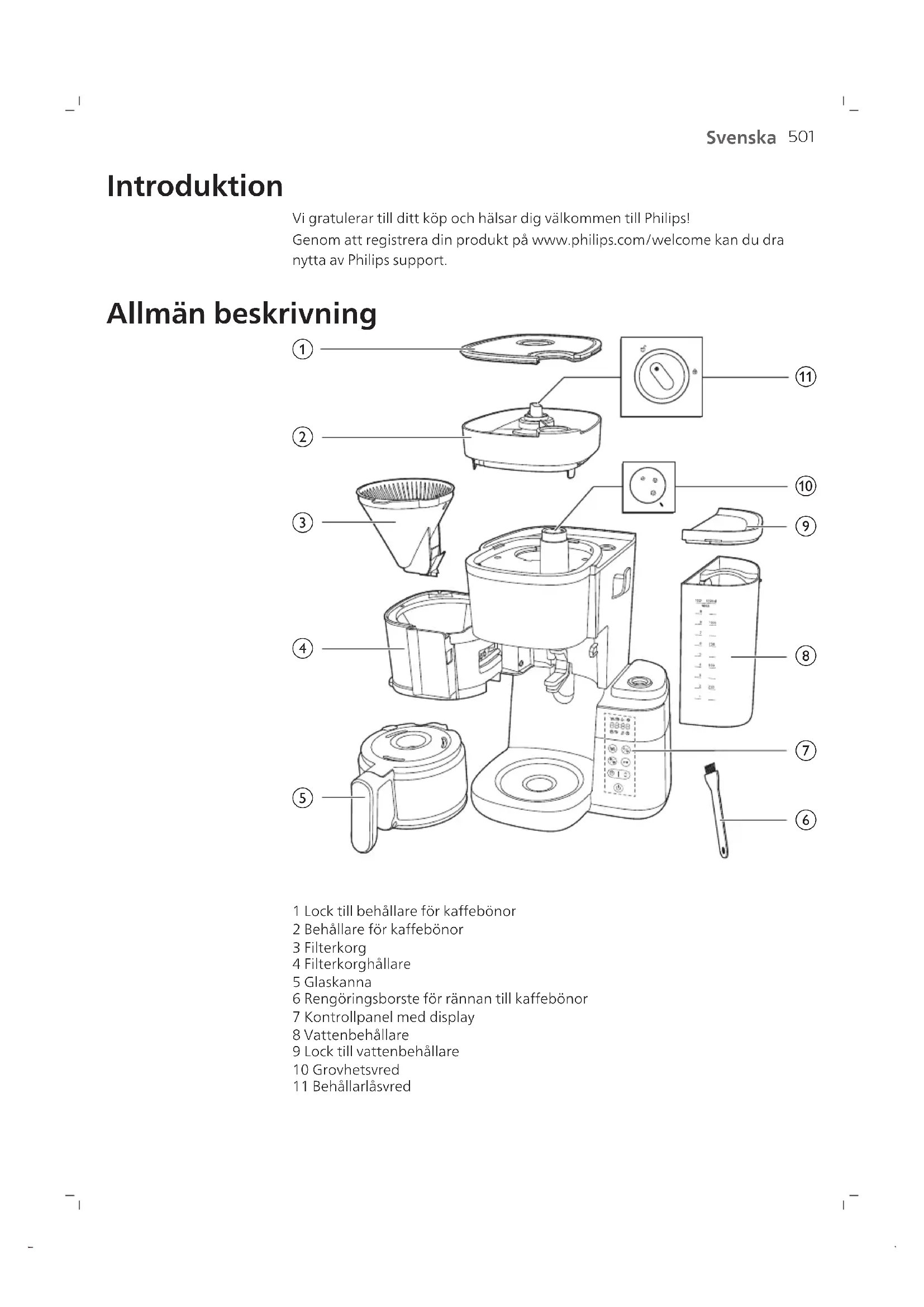 1 Lock till behållare för kaffebönor 2 Behållare för kaffebönor 3 Filterkorg 4 Filterkorghållare 5 Glaskanna 6 Rengöringsborste för rännan till kaffebönor 7 Kontrollpanel med display 8 Vattenbehållare 9 Lock till vattenbehållare 10 Grovhetsvred 11 Behållarlåsvred502 Svenska Kontrollpanel Strömknapp Timerknapp och pilknapp för tidsjustering Start/paus-knapp Rengöringsknapp Knapp för förmalet kaffe och kaffestyrka Knapp för koppval Displayikon Antal koppar Varmhållningsläge Förmalet kaffe Kaffestyrka Avkalkning Avisering för manuell rengöring Låg vattennivå Timer503 Svenska Tidsvisning De två första siffrorna anger timmar och de två sista siffrorna anger minuter. Vrid vredet till upplåsningsläget och därefter kan du ta ut behållaren för kaffebönor ur apparaten. Det här vredet väljer hur grovmalet kaffet är, där den större storleken innebär grövre malning. Kannläge Droppstoppfunktionen finns i kannläget. Obs! Bryggningsprocessen stoppar inte när du tar bort kannan. Om du inte trycker tillbaka kannan i apparaten inom 20sekunder svämmar filterkorgen över. Koppläge Vrid vredet manuellt från kopp- till kannläget för att öppna droppstoppfunktionen för att förhindra dropp när bryggningen är klar Obs! En kall keramikmugg stjäl värme från kaffet när den värmer upp sig själv, så förvärm koppen med varmt vatten. Viktigt Varning