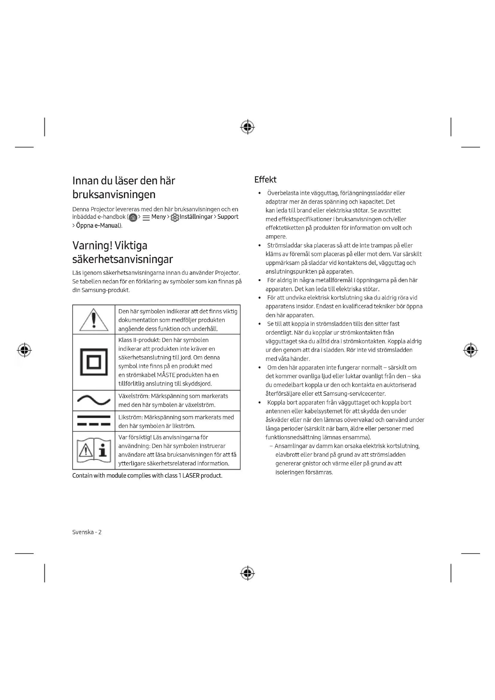 - Dependendo do modelo ou da área geográfica onde se encontra, estas licenças poderão não ser suportadas. The terms HDMI and HDMI High-Definition Multimedia Interface, and the HDMI Logo are trademarks or registered trademarks of HDMI Licensing Administrator, Inc. in the United States and other countries.Esta página foi deixada em branco intencionalmente.Svenska - 2 Innan du läser den här bruksanvisningen Denna Projector levereras med den här bruksanvisningen och en inbäddad e-handbok ( > Meny > Inställningar > Support > Öppna e-Manual). Varning! Viktiga säkerhetsanvisningar Läs igenom säkerhetsanvisningarna innan du använder Projector. Se tabellen nedan för en förklaring av symboler som kan finnas på din Samsung-produkt. Den här symbolen indikerar att det finns viktig dokumentation som medföljer produkten angående dess funktion och underhåll. Klass II-produkt: Den här symbolen indikerar att produkten inte kräver en säkerhetsanslutning till jord. Om denna symbol inte finns på en produkt med en strömkabel MÅSTE produkten ha en tillförlitlig anslutning till skyddsjord. Växelström: Märkspänning som markerats med den här symbolen är växelström. Likström: Märkspänning som markerats med den här symbolen är likström. Var försiktig! Läs anvisningarna för användning: Den här symbolen instruerar användare att läsa bruksanvisningen för att få ytterligare säkerhetsrelaterad information. Contain with module complies with class 1 LASER product. Effekt