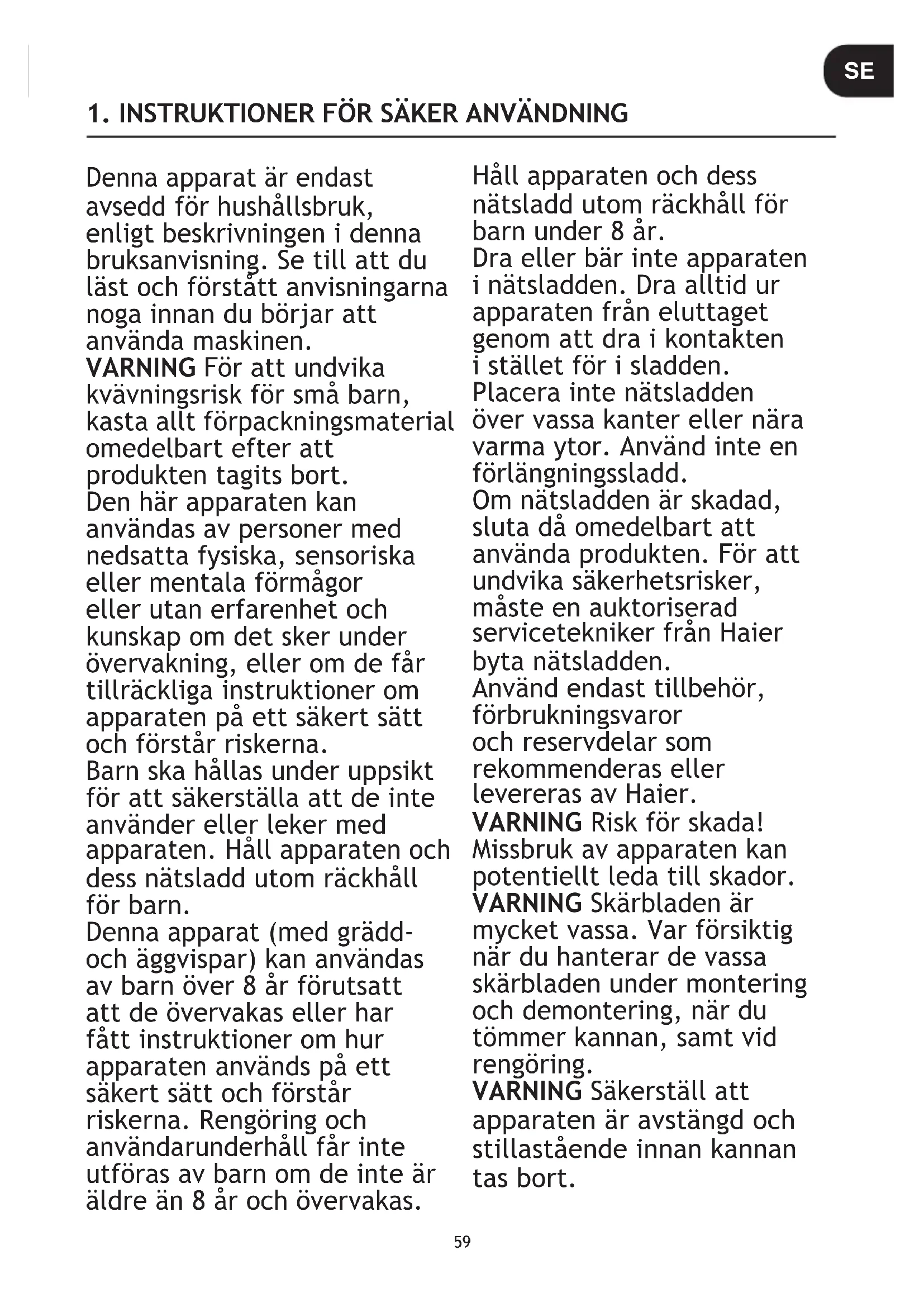 Elektrisk tilkobling 220-240V~50/60Hz Strøm 1000W NO59 Denna apparat är endast avsedd för hushållsbruk, enligt beskrivningen i denna bruksanvisning. Se till att du läst och förstått anvisningarna noga innan du börjar att använda maskinen. VARNING För att undvika kvävningsrisk för små barn, kasta allt förpackningsmaterial omedelbart efter att produkten tagits bort. Den här apparaten kan användas av personer med nedsatta fysiska, sensoriska eller mentala förmågor eller utan erfarenhet och kunskap om det sker under övervakning, eller om de får tillräckliga instruktioner om apparaten på ett säkert sätt och förstår riskerna. Barn ska hållas under uppsikt för att säkerställa att de inte använder eller leker med apparaten. Håll apparaten och dess nätsladd utom räckhåll för barn. Denna apparat (med grädd- och äggvispar) kan användas av barn över 8 år förutsatt att de övervakas eller har fått instruktioner om hur apparaten används på ett säkert sätt och förstår riskerna. Rengöring och användarunderhåll får inte utföras av barn om de inte är äldre än 8 år och övervakas. Håll apparaten och dess nätsladd utom räckhåll för barn under 8 år. Dra eller bär inte apparaten i nätsladden. Dra alltid ur apparaten från eluttaget genom att dra i kontakten i stället för i sladden. Placera inte nätsladden över vassa kanter eller nära varma ytor. Använd inte en förlängningssladd. Om nätsladden är skadad, sluta då omedelbart att använda produkten. För att undvika säkerhetsrisker, måste en auktoriserad servicetekniker från Haier byta nätsladden. Använd endast tillbehör, förbrukningsvaror och reservdelar som rekommenderas eller levereras av Haier. VARNING Risk för skada! Missbruk av apparaten kan potentiellt leda till skador. VARNING Skärbladen är mycket vassa. Var försiktig när du hanterar de vassa skärbladen under montering och demontering, när du tömmer kannan, samt vid rengöring. VARNING Säkerställ att