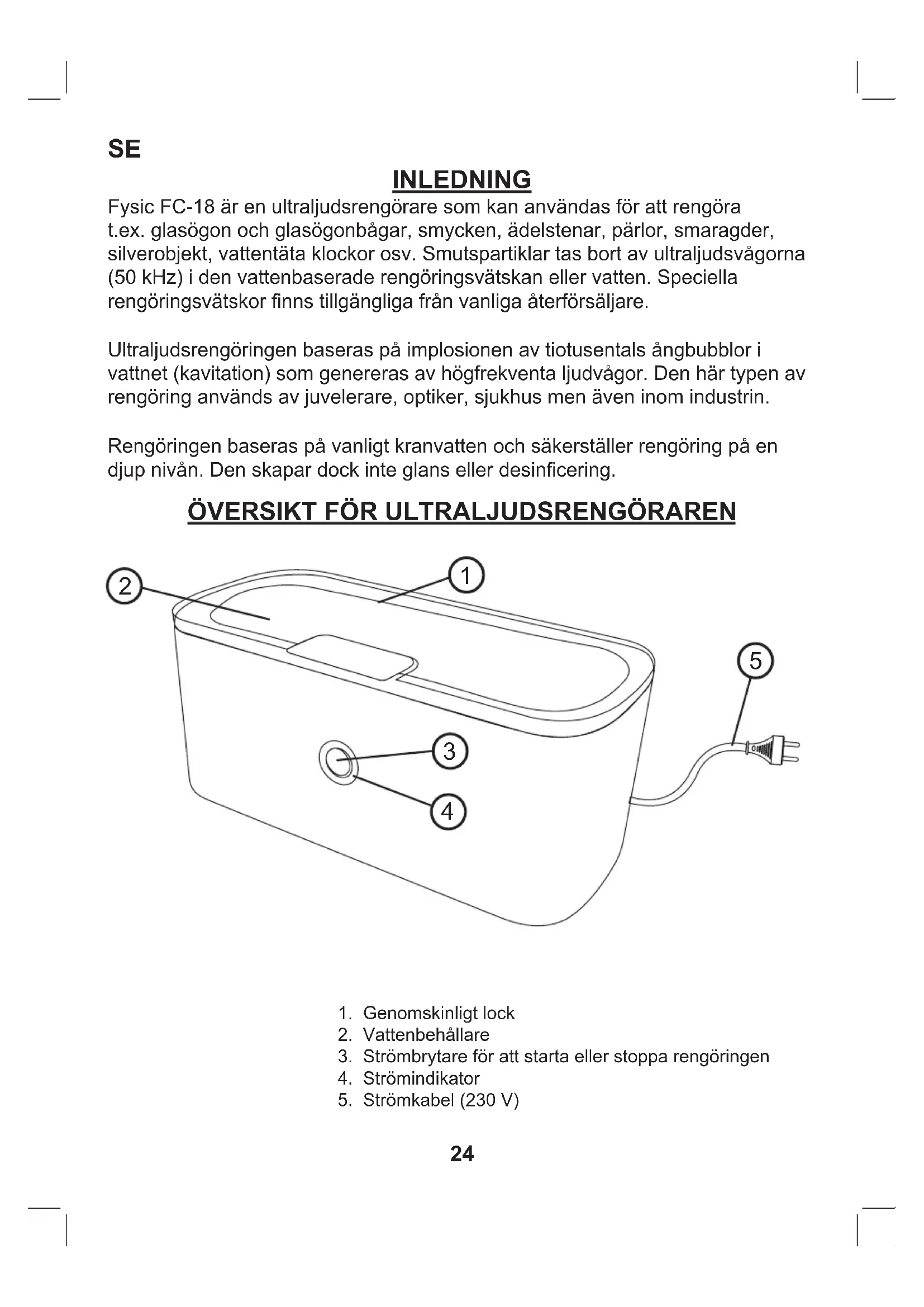 INLEDNING Fysic FC-18 är en ultraljudsrengörare som kan användas för att rengöra t.ex. glasögon och glasögonbågar, smycken, ädelstenar, pärlor, smaragder, silverobjekt, vattentäta klockor osv. Smutspartiklar tas bort av ultraljudsvågorna (50 kHz) i den vattenbaserade rengöringsvätskan eller vatten. Speciella rengöringsvätskor nns tillgängliga från vanliga återförsäljare. Ultraljudsrengöringen baseras på implosionen av tiotusentals ångbubblor i vattnet (kavitation) som genereras av högfrekventa ljudvågor. Den här typen av rengöring används av juvelerare, optiker, sjukhus men även inom industrin. Rengöringen baseras på vanligt kranvatten och säkerställer rengöring på en djup nivån. Den skapar dock inte glans eller desincering.