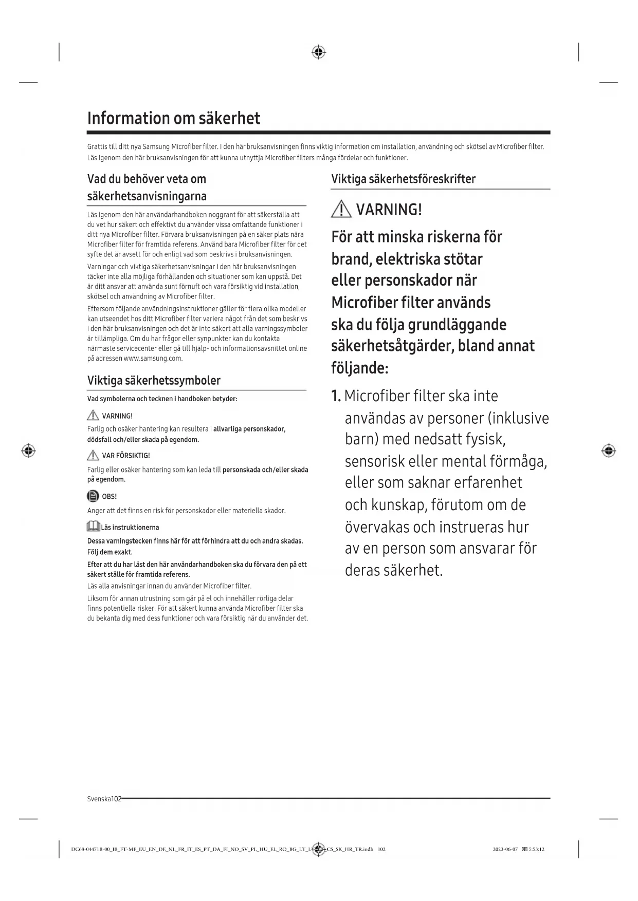- Dimensjonene som er oppgitt her kan variere litt fra de faktiske målene avhengig av målemetoden. DC68-04471B-00_IB_FT-MF_EU_EN_DE_NL_FR_IT_ES_PT_DA_FI_NO_SV_PL_HU_EL_RO_BG_LT_LV_ET_CS_SK_HR_TR.indb 101 2023-06-07 5:53:11Svenska102 Information om säkerhet Grattis till ditt nya Samsung Microfiber filter. I den här bruksanvisningen finns viktig information om installation, användning och skötsel av Microfiber filter. Läs igenom den här bruksanvisningen för att kunna utnyttja Microfiber filters många fördelar och funktioner. Vad du behöver veta om säkerhetsanvisningarna Läs igenom den här användarhandboken noggrant för att säkerställa att du vet hur säkert och effektivt du använder vissa omfattande funktioner i ditt nya Microfiber filter. Förvara bruksanvisningen på en säker plats nära Microfiber filter för framtida referens. Använd bara Microfiber filter för det syfte det är avsett för och enligt vad som beskrivs i bruksanvisningen. Varningar och viktiga säkerhetsanvisningar i den här bruksanvisningen täcker inte alla möjliga förhållanden och situationer som kan uppstå. Det är ditt ansvar att använda sunt förnuft och vara försiktig vid installation, skötsel och användning av Microfiber filter. Eftersom följande användningsinstruktioner gäller för flera olika modeller kan utseendet hos ditt Microfiber filter variera något från det som beskrivs i den här bruksanvisningen och det är inte säkert att alla varningssymboler är tillämpliga. Om du har frågor eller synpunkter kan du kontakta närmaste servicecenter eller gå till hjälp- och informationsavsnittet online på adressen www.samsung.com. Viktiga säkerhetssymboler Vad symbolerna och tecknen i handboken betyder: VARNING! Farlig och osäker hantering kan resultera i allvarliga personskador, dödsfall och/eller skada på egendom. VAR FÖRSIKTIG! Farlig eller osäker hantering som kan leda till personskada och/eller skada på egendom. OBS! Anger att det finns en risk för personskador eller materiella skador. Läs instruktionerna Dessa varningstecken finns här för att förhindra att du och andra skadas. Följ dem exakt. Efter att du har läst den här användarhandboken ska du förvara den på ett säkert ställe för framtida referens. Läs alla anvisningar innan du använder Microfiber filter. Liksom för annan utrustning som går på el och innehåller rörliga delar finns potentiella risker. För att säkert kunna använda Microfiber filter ska du bekanta dig med dess funktioner och vara försiktig när du använder det. Viktiga säkerhetsföreskrifter VARNING! För att minska riskerna för brand, elektriska stötar eller personskador när Microfiber filter används ska du följa grundläggande säkerhetsåtgärder, bland annat följande: