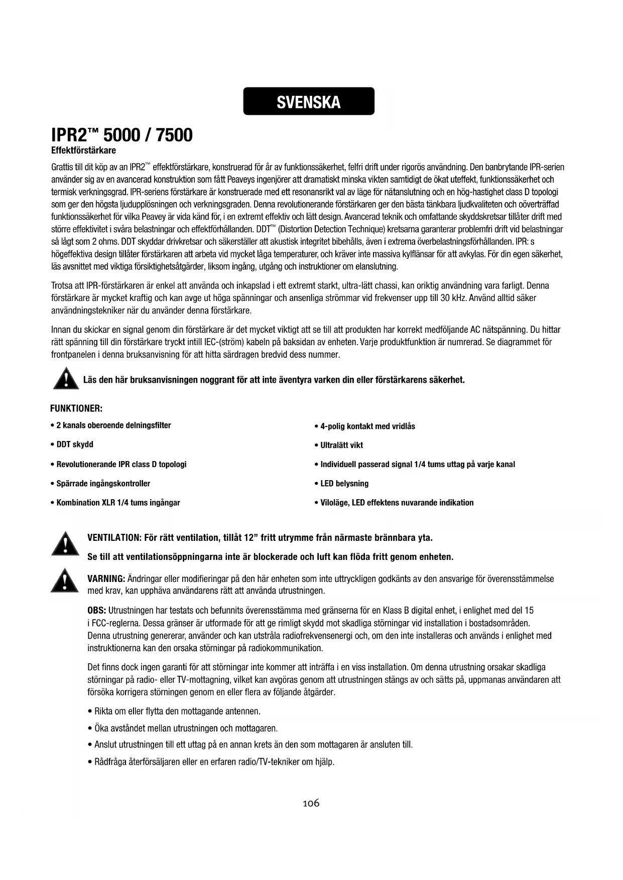 (Distortion Detection Technique) kretsarna garanterar problemfri drift vid belastningar så lågt som 2 ohms. DDT skyddar drivkretsar och säkerställer att akustisk integritet bibehålls, även i extrema överbelastningsförhållanden. IPR: s högeffektiva design tillåter förstärkaren att arbeta vid mycket låga temperaturer, och kräver inte massiva kylflänsar för att avkylas. För din egen säkerhet, läs avsnittet med viktiga försiktighetsåtgärder, liksom ingång, utgång och instruktioner om elanslutning. Trotsa att IPR-förstärkaren är enkel att använda och inkapslad i ett extremt starkt, ultra-lätt chassi, kan oriktig användning vara farligt. Denna förstärkare är mycket kraftig och kan avge ut höga spänningar och ansenliga strömmar vid frekvenser upp till 30 kHz. Använd alltid säker användningstekniker när du använder denna förstärkare. Innan du skickar en signal genom din förstärkare är det mycket viktigt att se till att produkten har korrekt medföljande AC nätspänning. Du hittar rätt spänning till din förstärkare tryckt intill IEC-(ström) kabeln på baksidan av enheten. Varje produktfunktion är numrerad. Se diagrammet för frontpanelen i denna bruksanvisning för att hitta särdragen bredvid dess nummer. Läs den här bruksanvisningen noggrant för att inte äventyra varken din eller förstärkarens säkerhet. SVENSKA VENTILATION: För rätt ventilation, tillåt 12” fritt utrymme från närmaste brännbara yta. Se till att ventilationsöppningarna inte är blockerade och luft kan flöda fritt genom enheten. FUNKTIONER: