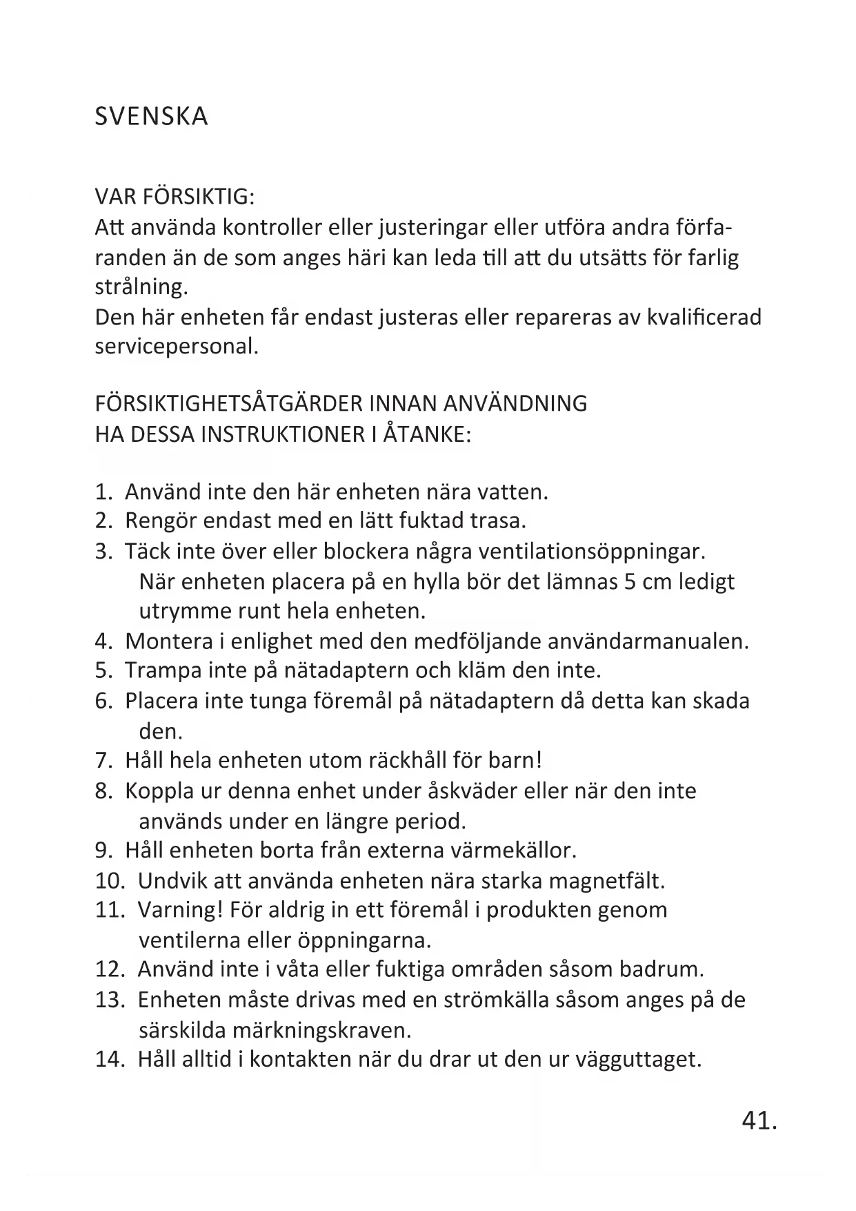 14. Håll alltid i kontakten när du drar ut den ur vägguttaget.42.