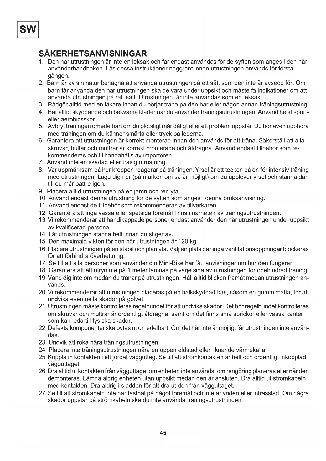 skador uppstår på strömkabeln ska du inte använda träningsutrustningen.46 VARNING Rådgör alltid med en läkare innan du påbörjar regelbunden träning. Ett regelbundet och intensivt träningsschema bör godkännas av en läkare innan du börjar. Detta gäller främst personer som är 35 år eller äldre eller de som har en medicinska bakgrund som motiverar ett sådant. Läs hela bruksanvisningen innan du börjar träna. Vi tar inget ansvar för personskador eller fysiska obehag som kan uppstå vid användningen av den här enheten och ska inte hållas ansvariga som ett resul- tat av detta. Spara den här bruksanvisningen och läs den noggrant. Personskador kan orsakas av felaktig eller överdriven användning av den här enheten. Den maximala vikten som får placeras på den här enheten är 120 kg. Den här användarhandboken är skriven för att underlätta monteringen av enheten och förklara en korrekt användning samtidigt som hur man undviker påfrestningar. För att bekanta dig med de olika separata delarna som den här utrustning har rekommenderar vi att du läser tabellen med komponenter innan monteringen påbörjas. Placera alla delar inom räckhåll och ta bort allt förpackningsmaterial för att kontrollera att alla är närvarande. Se nästa sida för monte- ring. KASSERA ENHETEN Produktförpackningar kan återanvändas eller kasseras för återvinning. Vi rekommenderar att för- packningen bevaras om du behöver transportera enheten vid ett senare tillfälle. Kontakta återför- säljaren omedelbart om någon transportskadad observeras när enheten packas upp. Den här produkten ska inte kasseras med det vanliga hushållsavfallet vid slutet av dess livscykel. Produkten ska istället lämnas in till en insamlingsplats för återvinning av elektrisk och elektronisk utrustning.
