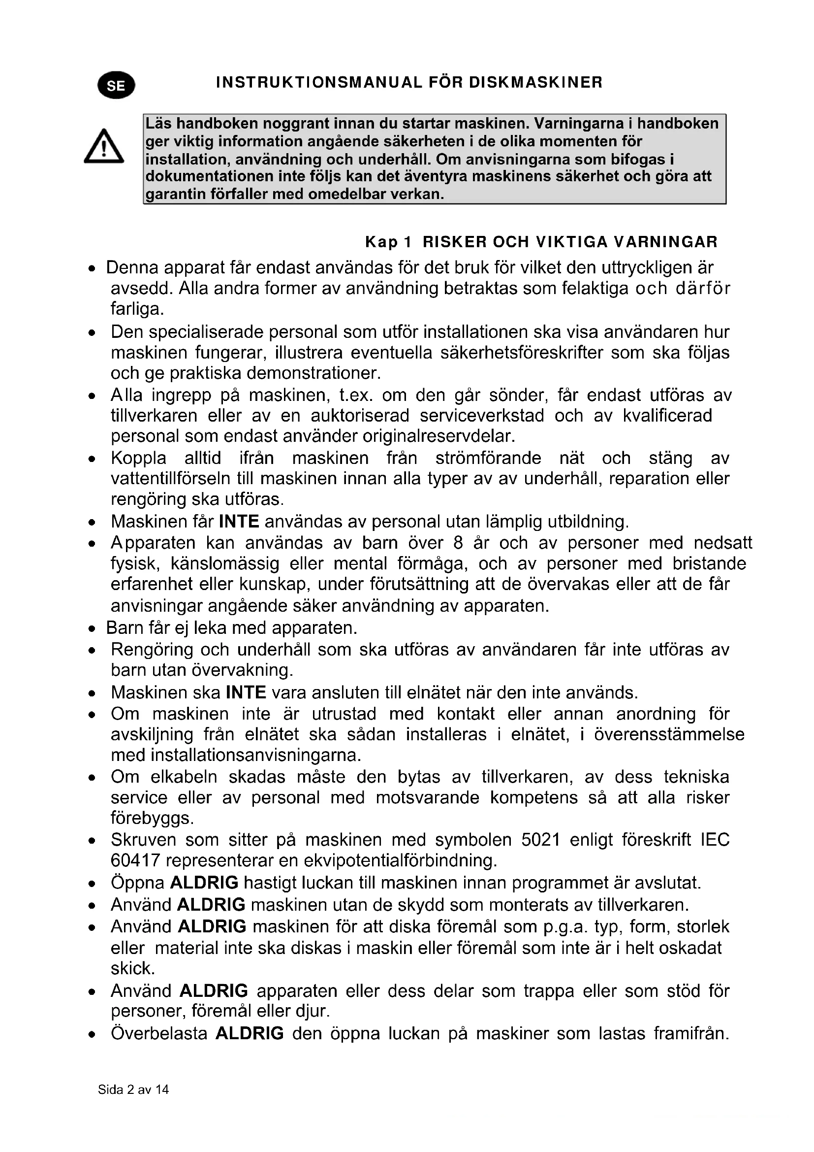 pparaten kan användas av barn över 8 år och av personer med nedsatt fysisk, känslomässig eller mental förmåga, och av personer med bristande erfarenhet eller kunskap, under förutsättning att de övervakas eller att de får anvisningar angående säker användning av apparaten. Barn får ej leka med apparaten. Rengöring och underhåll som ska utföras av användaren får inte utföras av barn utan övervakning. Maskinen ska INTE vara ansluten till elnätet när den inte används. Om maskinen inte är utrustad med kontakt eller annan anordning för avskiljning från elnätet ska sådan installeras i elnätet, i överensstämmelse med installationsanvisningarna. Om elkabeln skadas måste den bytas av tillverkaren, av dess tekniska service eller av personal med motsvarande kompetens så att alla risker förebyggs. Skruven som sitter på maskinen med symbolen 5021 enligt föreskrift IEC 60417 representerar en ekvipotentialförbindning. Öppna ALDRIG hastigt luckan till maskinen innan programmet är avslutat. Använd ALDRIG maskinen utan de skydd som monterats av tillverkaren. Använd ALDRIG maskinen för att diska föremål som p.g.a. typ, form, storlek eller material inte ska diskas i maskin eller föremål som inte är i helt oskadat skick. Använd ALDRIG apparaten eller dess delar som trappa eller som stöd för personer, föremål eller djur. Överbelasta ALDRIG den öppna luckan på maskiner som lastas framifrån.INSTRUKTIONSMANUAL FÖR DISKMASKINER Sida 3 av 14