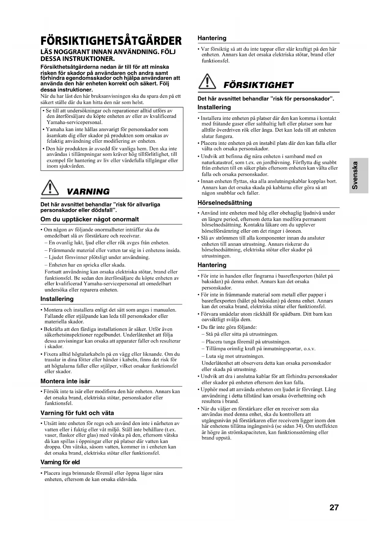 LÄS NOGGRANT INNAN ANVÄNDNING. FÖLJ DESSA INSTRUKTIONER. Försikthetsåtgärderna nedan är till för att minska risken för skador på användaren och andra samt förhindra egendomsskador och hjälpa användaren att använda den här enheten korrekt och säkert. Följ dessa instruktioner. När du har läst den här bruksanvisningen ska du spara den på ett säkert ställe där du kan hitta den när som helst. VARNING Det här avsnittet behandlar ”risk för allvarliga personskador eller dödsfall”. Om du upptäcker något onormalt