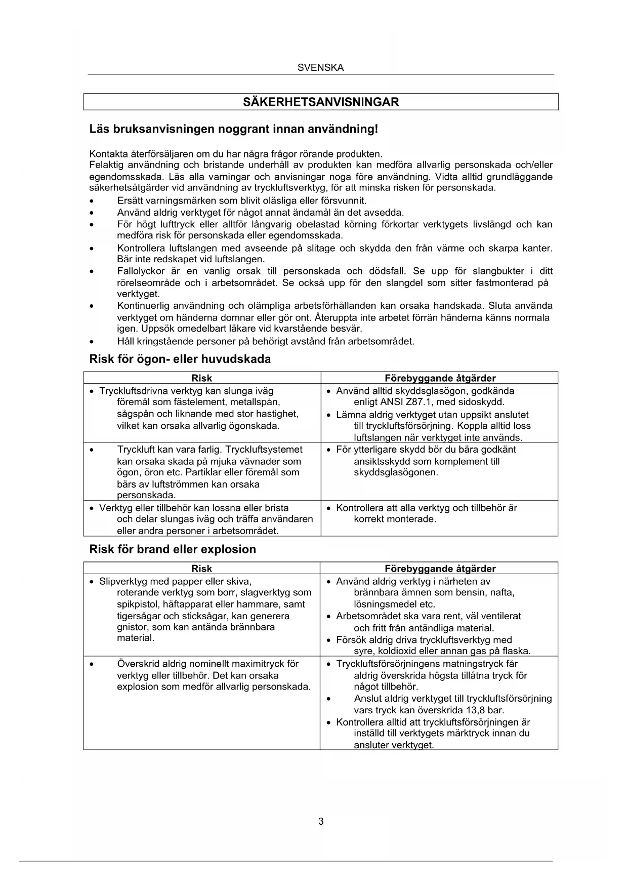 SVENSKA SÄKERHETSANVISNINGAR Läs bruksanvisningen noggrant innan användning! Kontakta återförsäljaren om du har några frågor rörande produkten. Felaktig användning och bristande underhåll av produkten kan medföra allvarlig personskada och/eller egendomsskada. Läs alla varningar och anvisningar noga före användning. Vidta alltid grundläggande säkerhetsåtgärder vid användning av tryckluftsverktyg, för att minska risken för personskada.