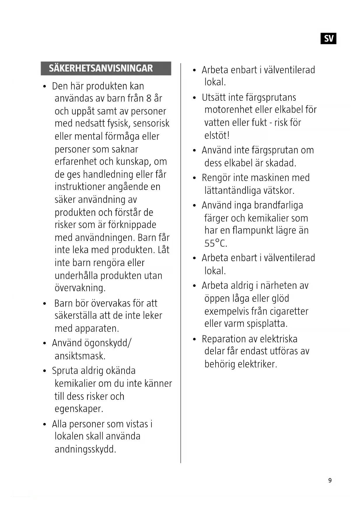 - Utsätt inte färgsprutans motorenhet eller elkabel för vatten eller fukt - risk för elstöt!