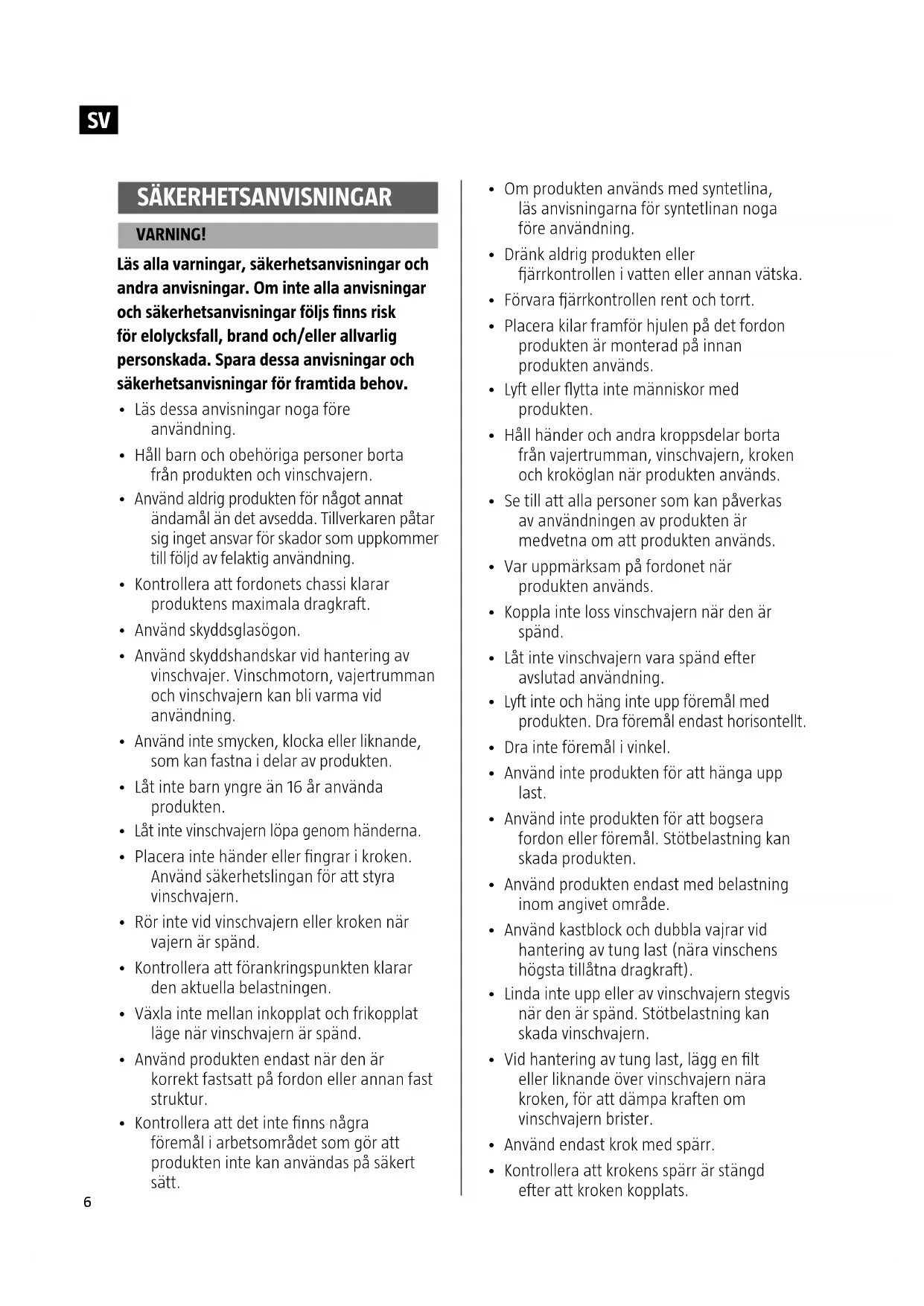 - Håll barn och obehöriga personer borta från produkten och vinschvajern.