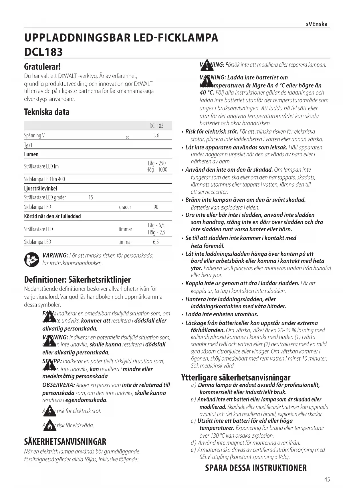 Typ 1LumenStrålkastare LED lmLåg - 250Hög - 1000Sidolampa LED lm 400LjusstrålevinkelStrålkastare LED grader 15Sidolampa LED grader 90Körtid när den är fulladdadStrålkastare LED timmarLåg - 6,5Hög - 2,5Sidolampa LED timmar 6,5 Gratulerar! Du har valt ett DeWALT ‑verktyg. År av erfarenhet, grundlig produktutveckling och innovation gör DeWALT till en av de pålitligaste partnerna för fackmannamässiga elverktygs‑användare. Tekniska data Svenska (översatt från de ursprungliga instruktionerna) UPPLADDNINGSBAR LED-FICKLAMPA DCL18346 SVENSKA Viktiga säkerhetsinstruktioner för all integrerad batteriladdning