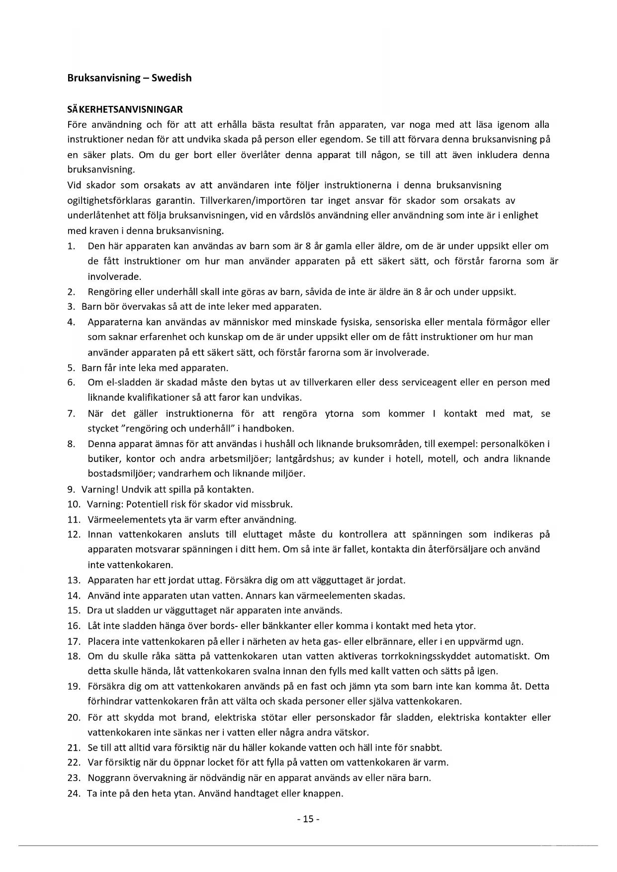 33. Vattenkokaren får endast användas i hushållet, inte utomhus.