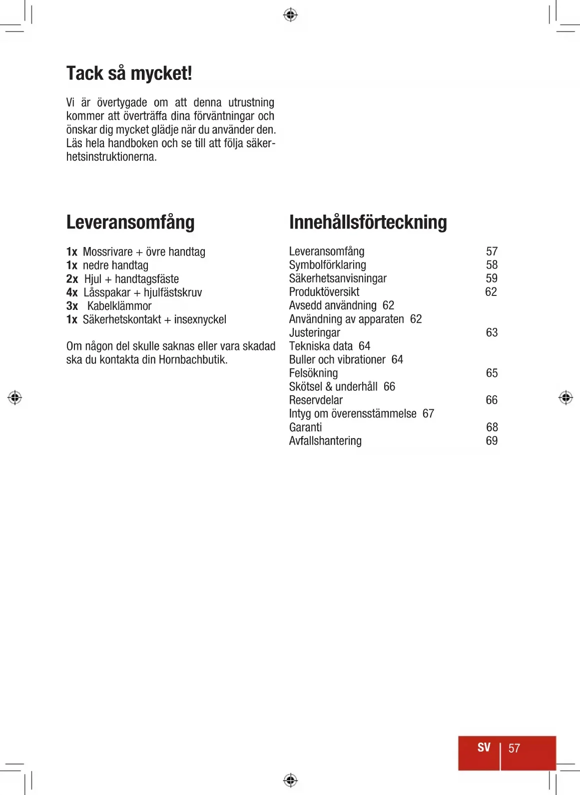 Tack så mycket! Vi är övertygade om att denna utrustning kommer att överträa dina förväntningar och önskar dig mycket glädje när du använder den. Läs hela handboken och se till att följa säker- hetsinstruktionerna. Leveransomfång 1x Mossrivare + övre handtag 1x nedre handtag 2x Hjul + handtagsfäste 4x Låsspakar + hjulfästskruv 3x Kabelklämmor 1x Säkerhetskontakt + insexnyckel Om någon del skulle saknas eller vara skadad ska du kontakta din Hornbachbutik. Innehållsförteckning Leveransomfång 57 Symbolförklaring 58 Säkerhetsanvisningar 59 Produktöversikt 62 Avsedd användning 62 Användning av apparaten 62 Justeringar 63 Tekniska data 64 Buller och vibrationer 64 Felsökning 65 Skötsel & underhåll 66 Reservdelar 66 Intyg om överensstämmelse 67 Garanti 68 Avfallshantering 69SV