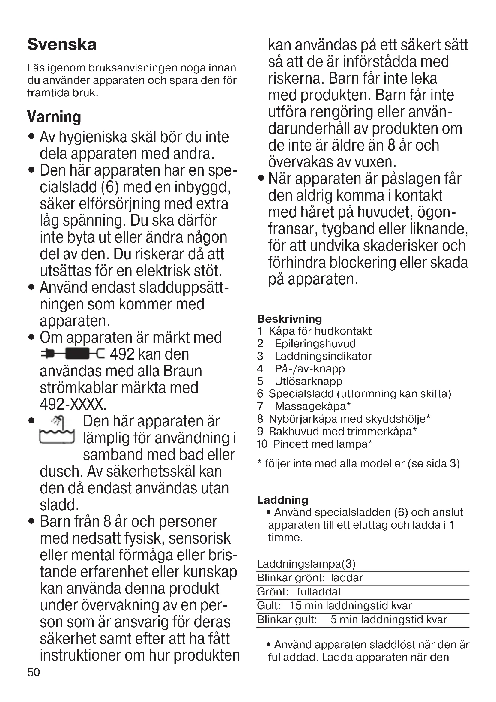 När apparaten är påslagen får den aldrig komma i kontakt med håret på huvudet, ögon- fransar, tygband eller liknande, för att undvika skaderisker och förhindra blockering eller skada på apparaten. Beskrivning 1 Kåpa för hudkontakt 2 Epileringshuvud 3 Laddningsindikator 4 På-/av-knapp 5 Utlösarknapp 6 Specialsladd (utformning kan skifta) 7 Massagekåpa* 8 Nybörjarkåpa med skyddshölje* 9 Rakhuvud med trimmerkåpa* 0 Pincett med lampa*