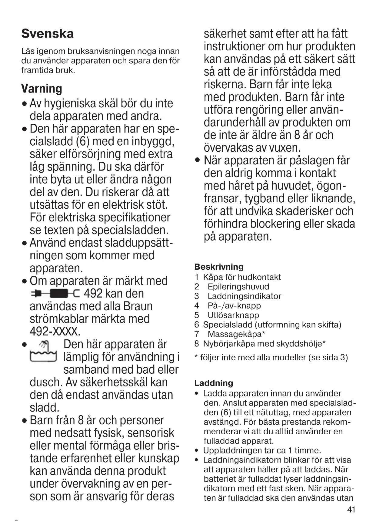 När apparaten är påslagen får den aldrig komma i kontakt med håret på huvudet, ögon- fransar, tygband eller liknande, för att undvika skaderisker och förhindra blockering eller skada på apparaten. Beskrivning 1 Kåpa för hudkontakt 2 Epileringshuvud 3 Laddningsindikator 4 På-/av-knapp 5 Utlösarknapp 6 Specialsladd (utformning kan skifta) 7 Massagekåpa* 8 Nybörjarkåpa med skyddshölje*
