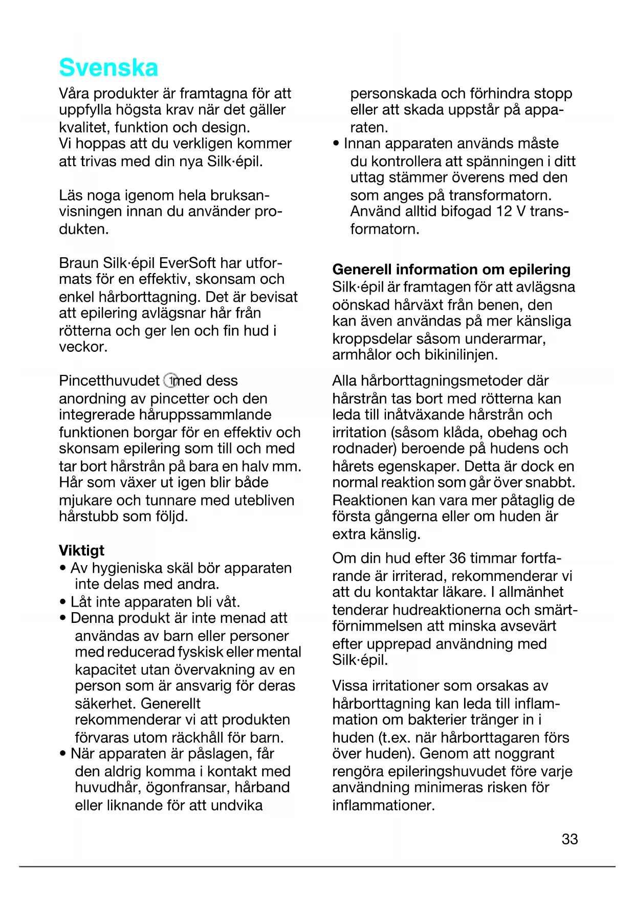 - Innan apparaten används måste du kontrollera att spänningen i ditt uttag stämmer överens med den som anges på transformatorn. Använd alltid bifogad 12 V trans- formatorn. Generell information om epilering Silk·épil är framtagen för att avlägsna oönskad hårväxt från benen, den kan även användas på mer känsliga kroppsdelar såsom underarmar, armhålor och bikinilinjen. Alla hårborttagningsmetoder där hårstrån tas bort med rötterna kan leda till inåtväxande hårstrån och irritation (såsom klåda, obehag och rodnader) beroende på hudens och hårets egenskaper. Detta är dock en normal reaktion som går över snabbt. Reaktionen kan vara mer påtaglig de första gångerna eller om huden är extra känslig. Om din hud efter 36 timmar fortfa- rande är irriterad, rekommenderar vi att du kontaktar läkare. I allmänhet tenderar hudreaktionerna och smärt- förnimmelsen att minska avsevärt efter upprepad användning med Silk·épil. Vissa irritationer som orsakas av hårborttagning kan leda till inflam- mation om bakterier tränger in i huden (t.ex. när hårborttagaren förs över huden). Genom att noggrant rengöra epileringshuvudet före varje användning minimeras risken för inflammationer.
