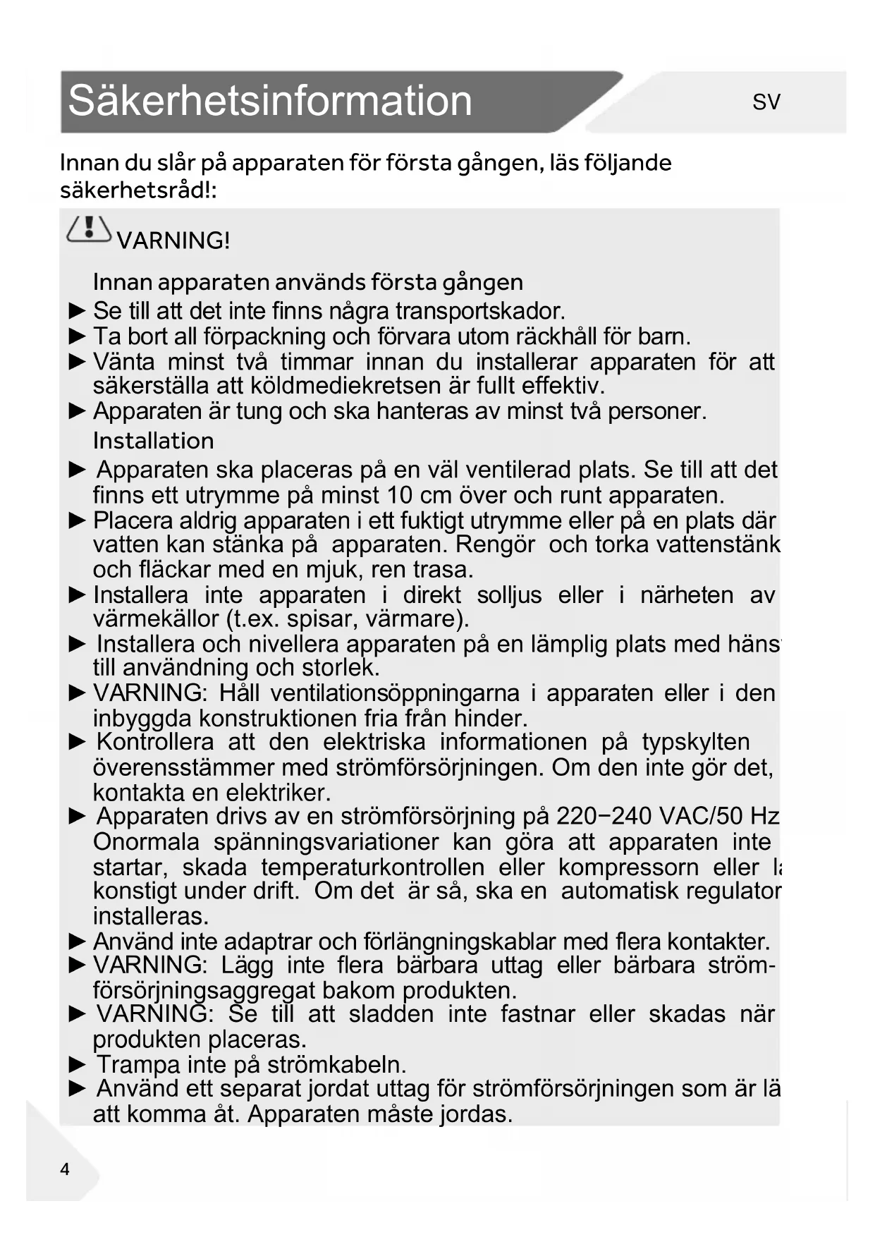 VARNING! Innan apparaten används första gången ► Se till att det inte finns några transportskador. ► Ta bort all förpackning och förvara utom räckhåll för barn. ► Vänta minst två timmar innan du installerar apparaten för att säkerställa att köldmediekretsen är fullt effektiv. ► Apparaten är tung och ska hanteras av minst två personer. Installation ► Apparaten ska placeras på en väl ventilerad plats. Se till att det finns ett utrymme på minst 10 cm över och runt apparaten. ► Placera aldrig apparaten i ett fuktigt utrymme eller på en plats där vatten kan stänka på apparaten. Rengör och torka vattenstänk och fläckar med en mjuk, ren trasa. ► Installera inte apparaten i direkt solljus eller i närheten av värmekällor (t.ex. spisar, värmare). ► Installera och nivellera apparaten på en lämplig plats med hänsyn till användning och storlek. ► VARNING: Håll ventilationsöppningarna i apparaten eller i den inbyggda konstruktionen fria från hinder. ► Kontrollera att den elektriska informationen på typskylten överensstämmer med strömförsörjningen. Om den inte gör det, kontakta en elektriker. ► Apparaten drivs av en strömförsörjning på 220−240 VAC/50 Hz. Onormala spänningsvariationer kan göra att apparaten inte startar, skada temperaturkontrollen eller kompressorn eller låta konstigt under drift. Om det är så, ska en automatisk regulator installeras. ► Använd inte adaptrar och förlängningskablar med flera kontakter. ► VARNING: Lägg inte flera bärbara uttag eller bärbara ström- försörjningsaggregat bakom produkten. ► VARNING: Se till att sladden inte fastnar eller skadas när produkten placeras. ► Trampa inte på strömkabeln. ► Använd ett separat jordat uttag för strömförsörjningen som är lätt att komma åt. Apparaten måste jordas.SV Säkerhetsinformation