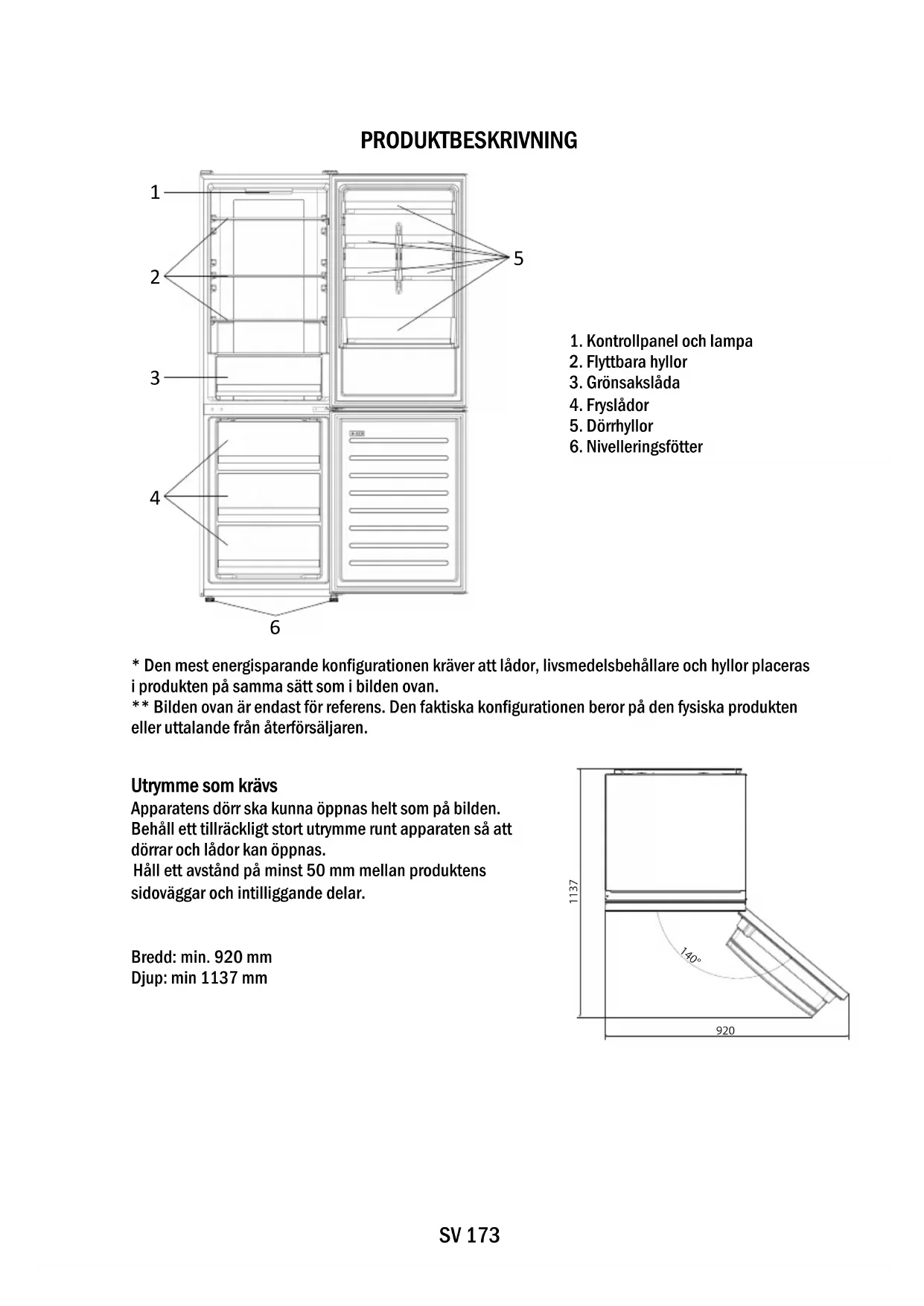 - Den mest energisparande konfigurationen kräver att lådor, livsmedelsbehållare och hyllor placeras i produkten på samma sätt som i bilden ovan. ** Bilden ovan är endast för referens. Den faktiska konfigurationen beror på den fysiska produkten eller uttalande från återförsäljaren. Utrymme som krävs Apparatens dörr ska kunna öppnas helt som på bilden. Behåll ett tillräckligt stort utrymme runt apparaten så att dörrar och lådor kan öppnas. Håll ett avstånd på minst 50 mm mellan produktens sidoväggar och intilliggande delar. Bredd: min. 920 mm Djup: min 1137 mm