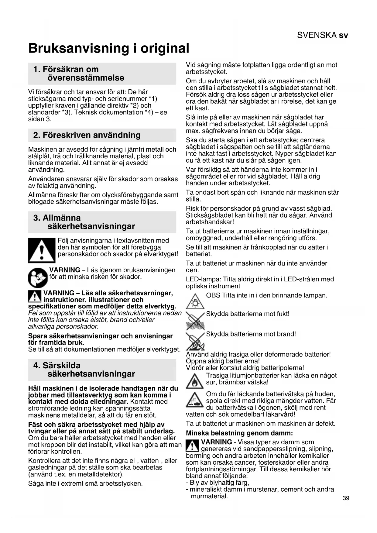 Bruksanvisning i original Vi försäkrar och tar ansvar för att: De här sticksågarna med typ- och serienummer *1) uppfyller kraven i gällande direktiv *2) och standarder *3). Teknisk dokumentation *4) – se sidan 3. Maskinen är avsedd för sågning i järnfri metall och stålplåt, trä och träliknande material, plast och liknande material. Allt annat är ej avsedd användning. Användaren ansvarar själv för skador som orsakas av felaktig användning. Allmänna föreskrifter om olycksförebyggande samt bifogade säkerhetsanvisningar måste följas. Följ anvisningarna i textavsnitten med den här symbolen för att förebygga personskador och skador på elverktyget! VARNING – Läs igenom bruksanvisningen för att minska risken för skador. VARNING – Läs alla säkerhetsvarningar, instruktioner, illustrationer och specifikationer som medföljer detta elverktyg. Fel som uppstår till följd av att instruktionerna nedan inte följts kan orsaka elstöt, brand och/eller allvarliga personskador. Spara säkerhetsanvisningar och anvisningar för framtida bruk. Se till så att dokumentationen medföljer elverktyget. Håll maskinen i de isolerade handtagen när du jobbar med tillsatsverktyg som kan komma i kontakt med dolda elledningar. Kontakt med strömförande ledning kan spänningssätta maskinens metalldelar, så att du får en stöt. Fäst och säkra arbetsstycket med hjälp av tvingar eller på annat sätt på stabilt underlag. Om du bara håller arbetsstycket med handen eller mot kroppen blir det instabilt, vilket kan göra att man förlorar kontrollen. Kontrollera att det inte finns några el-, vatten-, eller gasledningar på det ställe som ska bearbetas (använd t.ex. en metalldetektor). Såga inte i extremt små arbetsstycken. Vid sågning måste fotplattan ligga ordentligt an mot arbetsstycket. Om du avbryter arbetet, slå av maskinen och håll den stilla i arbetsstycket tills sågbladet stannat helt. Försök aldrig dra loss sågen ur arbetsstycket eller dra den bakåt när sågbladet är i rörelse, det kan ge ett kast. Slå inte på eller av maskinen när sågbladet har kontakt med arbetsstycket. Låt sågbladet uppnå max. sågfrekvens innan du börjar såga. Ska du starta sågen i ett arbetsstycke; centrera sågbladet i sågspalten och se till att sågtänderna inte hakat fast i arbetsstycket. Nyper sågbladet kan du få ett kast när du slår på sågen igen. Var försiktig så att händerna inte kommer in i sågområdet eller rör vid sågbladet. Håll aldrig handen under arbetsstycket. Ta endast bort spån och liknande när maskinen står stilla. Risk för personskador på grund av vasst sågblad. Sticksågsbladet kan bli hett när du sågar. Använd arbetshandskar! Ta ut batterierna ur maskinen innan inställningar, ombyggnad, underhåll eller rengöring utförs. Se till att maskinen är frånkopplad när du sätter i batteriet. Ta ut batteriet ur maskinen när du inte använder den. LED-lampa: Titta aldrig direkt in i LED-strålen med optiska instrument OBS Titta inte in i den brinnande lampan. Skydda batterierna mot fukt! Skydda batterierna mot brand! Använd aldrig trasiga eller deformerade batterier! Öppna aldrig batterierna! Vidrör eller kortslut aldrig batteripolerna! Trasiga litiumjonbatterier kan läcka en något sur, brännbar vätska! Om du får läckande batterivätska på huden, spola direkt med rikliga mängder vatten. Får du batterivätska i ögonen, skölj med rent vatten och sök omedelbart läkarvård! Ta ut batteriet ur maskinen om maskinen är defekt. Minska belastning genom damm: VARNING - Vissa typer av damm som genereras vid sandpappersslipning, slipning, borrning och andra arbeten innehåller kemikalier som kan orsaka cancer, fosterskador eller andra fortplantningsstörningar. Till dessa kemikalier hör bland annat följande: - Bly av blyhaltig färg, - mineraliskt damm i murstenar, cement och andra murmaterial.