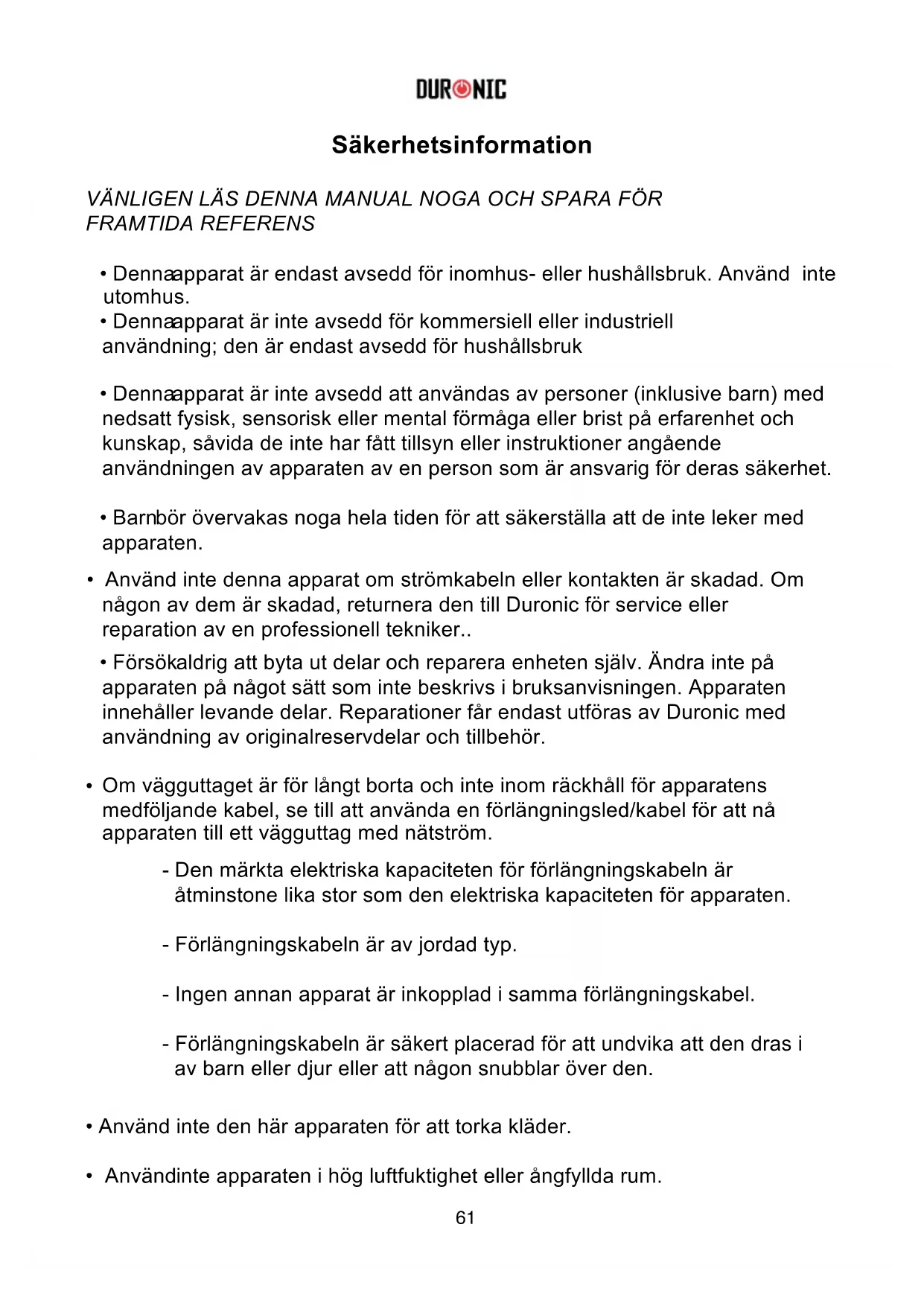 VÄNLIGEN LÄS DENNA MANUAL NOGA OCH SPARA FÖR FRAMTIDA REFERENS apparat är endast avsedd för inomhus- eller hushållsbruk. Använd inte utomhus. apparat är inte avsedd för kommersiell eller industriell användning; den är endast avsedd för hushållsbruk apparat är inte avsedd att användas av personer (inklusive barn) med nedsatt fysisk, sensorisk eller mental förmåga eller brist på erfarenhet och kunskap, såvida de inte har fått tillsyn eller instruktioner angående användningen av apparaten av en person som är ansvarig för deras säkerhet. bör övervakas noga hela tiden för att säkerställa att de inte leker med apparaten. aldrig att byta ut delar och reparera enheten själv. Ändra inte på apparaten på något sätt som inte beskrivs i bruksanvisningen. Apparaten innehåller levande delar. Reparationer får endast utföras av Duronic med användning av originalreservdelar och tillbehör. - Den märkta elektriska kapaciteten för förlängningskabeln är åtminstone lika stor som den elektriska kapaciteten för apparaten. - Förlängningskabeln är av jordad typ. - Ingen annan apparat är inkopplad i samma förlängningskabel. - Förlängningskabeln är säkert placerad för att undvika att den dras i av barn eller djur eller att någon snubblar över den.