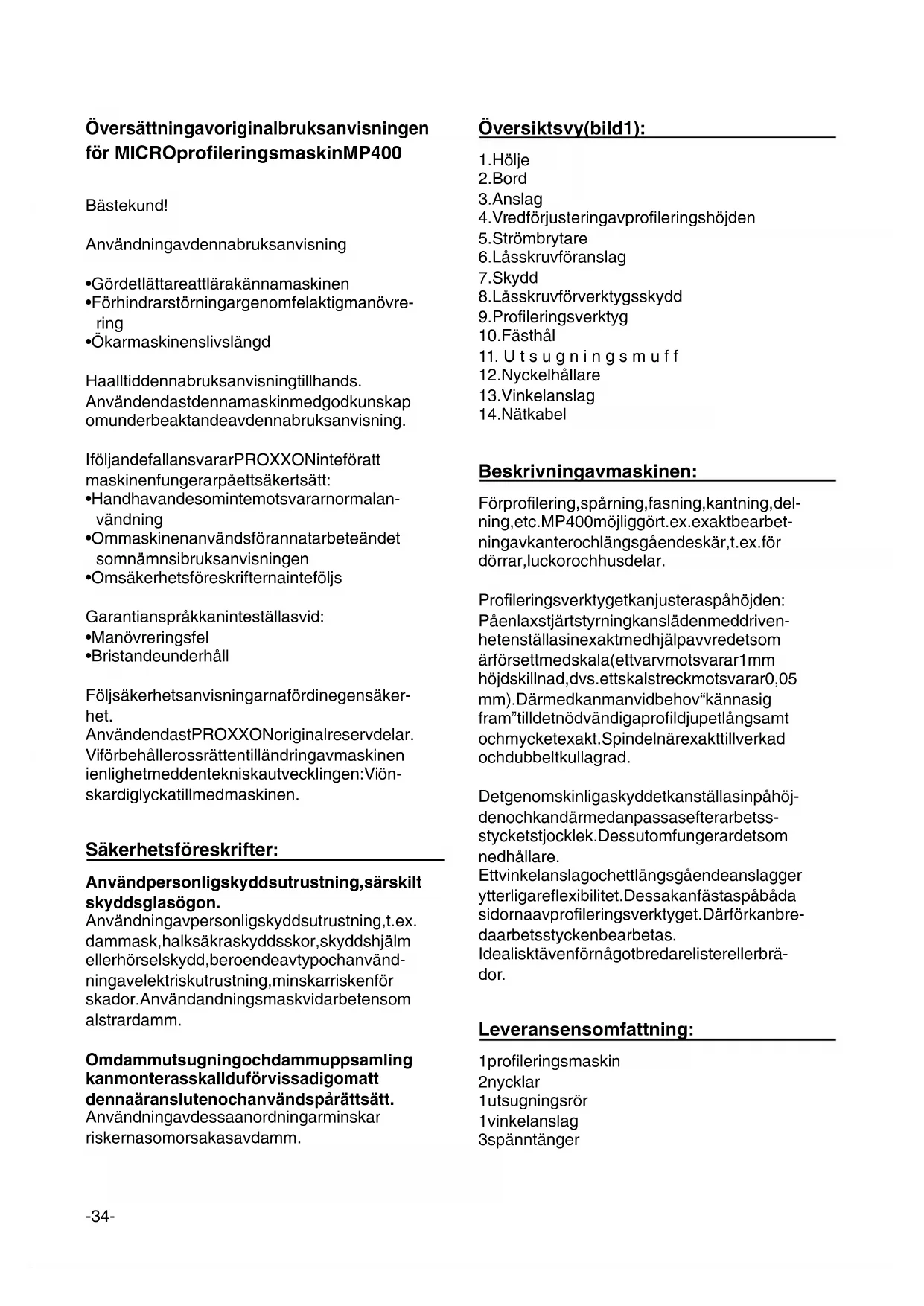 Dipl.-ing. Jörg Wagner PROXXON S.A. Forretningsområde maskinsikkerhed Den ansvarlige for CE-dokumentationen er identisk med undertegnedeÖversättning av originalbruksanvisningen för MICRO profileringsmaskin MP 400 Bäste kund! Användning av denna bruksanvisning