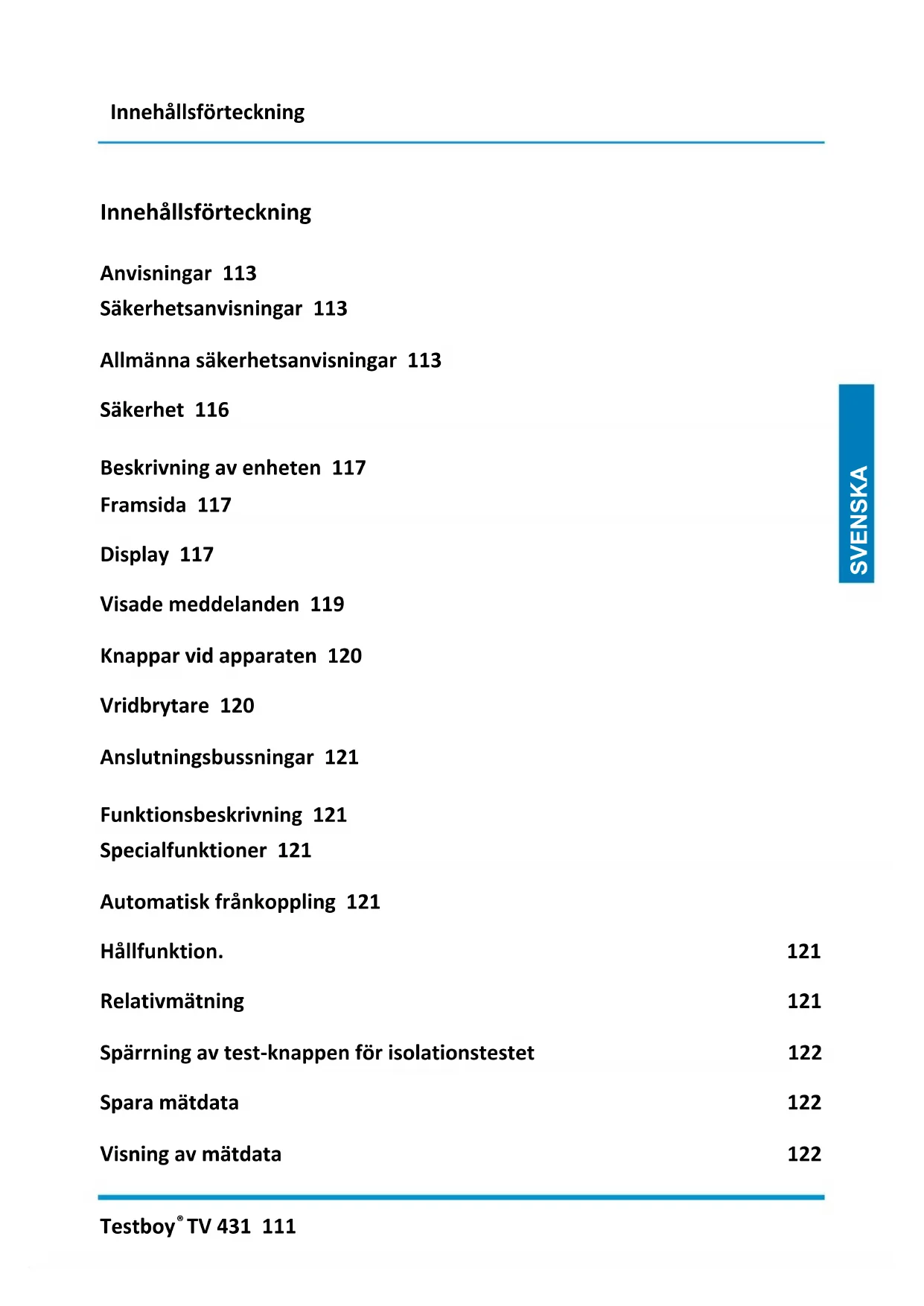 TV 431 111 SVENSKA Innehållsförteckning Anvisningar 113 Säkerhetsanvisningar 113 Allmänna säkerhetsanvisningar 113 Säkerhet 116 Beskrivning av enheten 117 Framsida 117 Display 117 Visade meddelanden 119 Knappar vid apparaten 120 Vridbrytare 120 Anslutningsbussningar 121 Funktionsbeskrivning 121 Specialfunktioner 121 Automatisk frånkoppling 121 Hållfunktion. 121 Relativmätning 121 Spärrning av test-knappen för isolationstestet 122 Spara mätdata 122 Visning av mätdata 122Innehållsförteckning Testboy