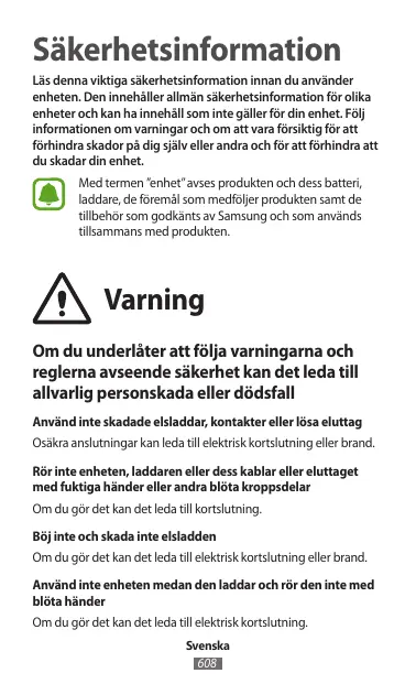 Säkerhetsinformation Läs denna viktiga säkerhetsinformation innan du använder enheten. Den innehåller allmän säkerhetsinformation för olika enheter och kan ha innehåll som inte gäller för din enhet. Följ informationen om varningar och om att vara försiktig för att förhindra skador på dig själv eller andra och för att förhindra att du skadar din enhet. Med termen ”enhet” avses produkten och dess batteri, laddare, de föremål som medföljer produkten samt de tillbehör som godkänts av Samsung och som används tillsammans med produkten.