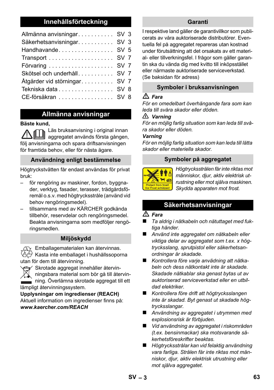 I respektive land gäller de garantivillkor som publicerats av våra auktoriserade distributörer. Eventuella fel på aggregatet repareras utan kostnad under förutsättning att det orsakats av ett material- eller tillverkningsfel. I frågor som gäller garantin ska du vända dig med kvitto till inköpsstället eller närmaste auktoriserade serviceverkstad. (Se baksidan för adress) Symboler i bruksanvisningen Fara Bäste kund, Läs bruksanvisning i original innan aggregatet används första gången, följ anvisningarna och spara driftsanvisningen för framtida behov, eller för nästa ägare. För en omedelbart överhängande fara som kan leda till svåra skador eller döden. 몇 Varning För en möjlig farlig situation som kan leda till svåra skador eller döden. Varning För en möjlig farlig situation som kan leda till lätta skador eller materiella skador. Användning enligt bestämmelse Symboler på aggregatet Allmänna anvisningar Högtryckstvätten får endast användas för privat bruk: – för rengöring av maskiner, fordon, byggnader, verktyg, fasader, terasser, trädgårdsföremål o.s.v. med högtrycksstråle (använd vid behov rengöringsmedel). – tillsammans med av KÄRCHER godkända tillbehör, reservdelar och rengöringsmedel. Beakta anvisningarna som medföljer rengöringsmedlen. Miljöskydd Emballagematerialen kan återvinnas. Kasta inte emballaget i hushållssoporna utan för dem till återvinning. Skrotade aggregat innehåller återvinningsbara material som bör gå till återvinning. Överlämna skrotade aggregat till ett lämpligt återvinningssystem. Upplysningar om ingredienser (REACH) Aktuell information om ingredienser finns på: www.kaercher.com/REACH Högtrycksstrålen får inte riktas mot människor, djur, aktiv elektrisk utrustning eller mot själva maskinen. Skydda apparaten mot frost. Säkerhetsanvisningar Fara Ta aldrig i nätkabeln och nätuttaget med fuktiga händer. Använd inte aggregatet om nätkabeln eller