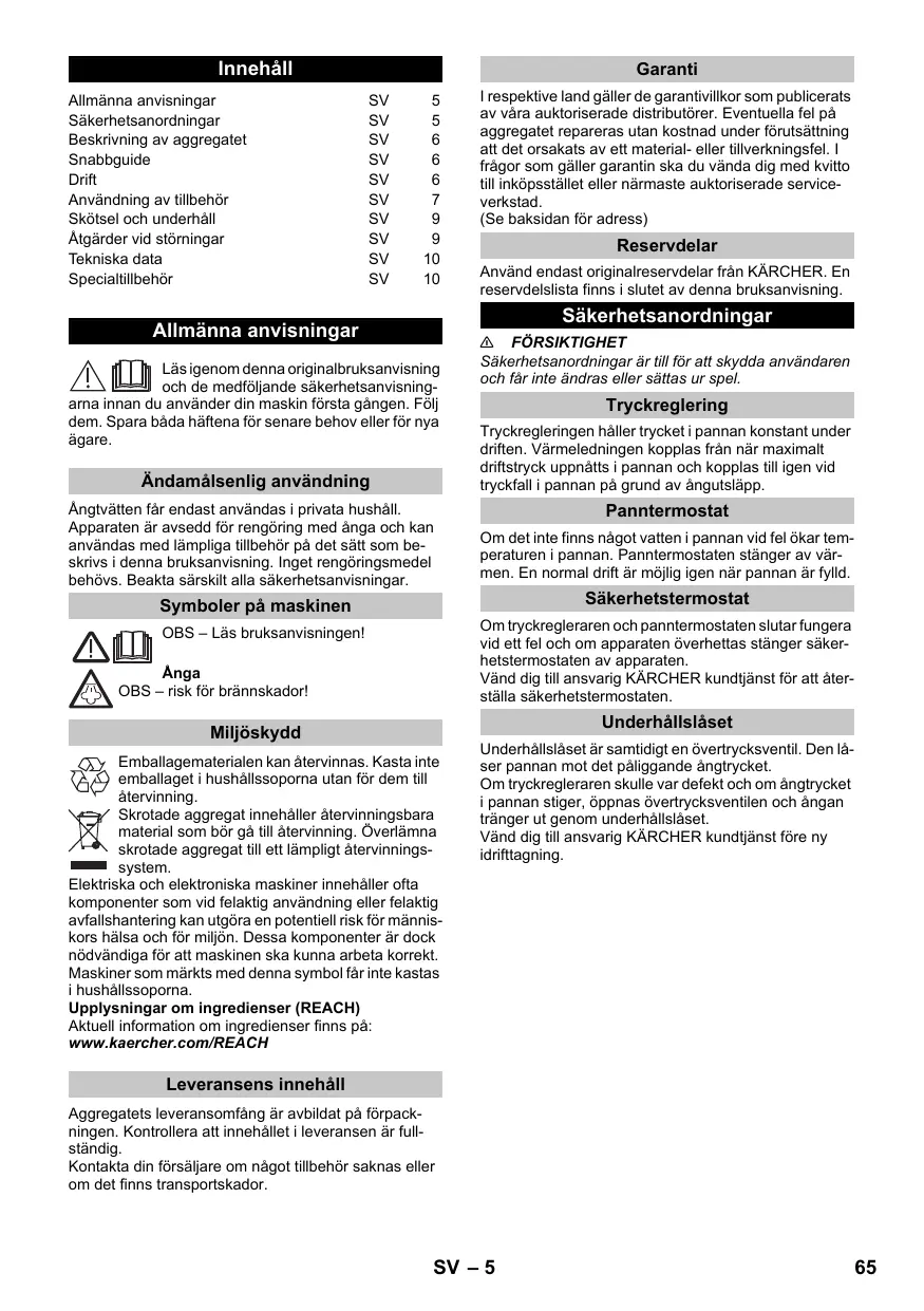 I respektive land gäller de garantivillkor som publicerats av våra auktoriserade distributörer. Eventuella fel på aggregatet repareras utan kostnad under förutsättning att det orsakats av ett material- eller tillverkningsfel. I frågor som gäller garantin ska du vända dig med kvitto till inköpsstället eller närmaste auktoriserade serviceverkstad. (Se baksidan för adress) Reservdelar Använd endast originalreservdelar från KÄRCHER. En reservdelslista finns i slutet av denna bruksanvisning. Säkerhetsanordningar Allmänna anvisningar Läs igenom denna originalbruksanvisning och de medföljande säkerhetsanvisningarna innan du använder din maskin första gången. Följ dem. Spara båda häftena för senare behov eller för nya ägare. 몇 FÖRSIKTIGHET Säkerhetsanordningar är till för att skydda användaren och får inte ändras eller sättas ur spel. Tryckreglering Ändamålsenlig användning Tryckregleringen håller trycket i pannan konstant under driften. Värmeledningen kopplas från när maximalt driftstryck uppnåtts i pannan och kopplas till igen vid tryckfall i pannan på grund av ångutsläpp. Ångtvätten får endast användas i privata hushåll. Apparaten är avsedd för rengöring med ånga och kan användas med lämpliga tillbehör på det sätt som beskrivs i denna bruksanvisning. Inget rengöringsmedel behövs. Beakta särskilt alla säkerhetsanvisningar. Om det inte finns något vatten i pannan vid fel ökar temperaturen i pannan. Panntermostaten stänger av värmen. En normal drift är möjlig igen när pannan är fylld. Panntermostat Säkerhetstermostat Symboler på maskinen Om tryckregleraren och panntermostaten slutar fungera vid ett fel och om apparaten överhettas stänger säkerhetstermostaten av apparaten. Vänd dig till ansvarig KÄRCHER kundtjänst för att återställa säkerhetstermostaten. OBS – Läs bruksanvisningen! Ånga OBS – risk för brännskador! Underhållslåset Miljöskydd Emballagematerialen kan återvinnas. Kasta inte emballaget i hushållssoporna utan för dem till återvinning. Skrotade aggregat innehåller återvinningsbara material som bör gå till återvinning. Överlämna skrotade aggregat till ett lämpligt återvinningssystem. Elektriska och elektroniska maskiner innehåller ofta komponenter som vid felaktig användning eller felaktig avfallshantering kan utgöra en potentiell risk för människors hälsa och för miljön. Dessa komponenter är dock nödvändiga för att maskinen ska kunna arbeta korrekt. Maskiner som märkts med denna symbol får inte kastas i hushållssoporna. Upplysningar om ingredienser (REACH) Aktuell information om ingredienser finns på: www.kaercher.com/REACH Underhållslåset är samtidigt en övertrycksventil. Den låser pannan mot det påliggande ångtrycket. Om tryckregleraren skulle var defekt och om ångtrycket i pannan stiger, öppnas övertrycksventilen och ångan tränger ut genom underhållslåset. Vänd dig till ansvarig KÄRCHER kundtjänst före ny idrifttagning. Leveransens innehåll Aggregatets leveransomfång är avbildat på förpackningen. Kontrollera att innehållet i leveransen är fullständig. Kontakta din försäljare om något tillbehör saknas eller om det finns transportskador. SV – 5
