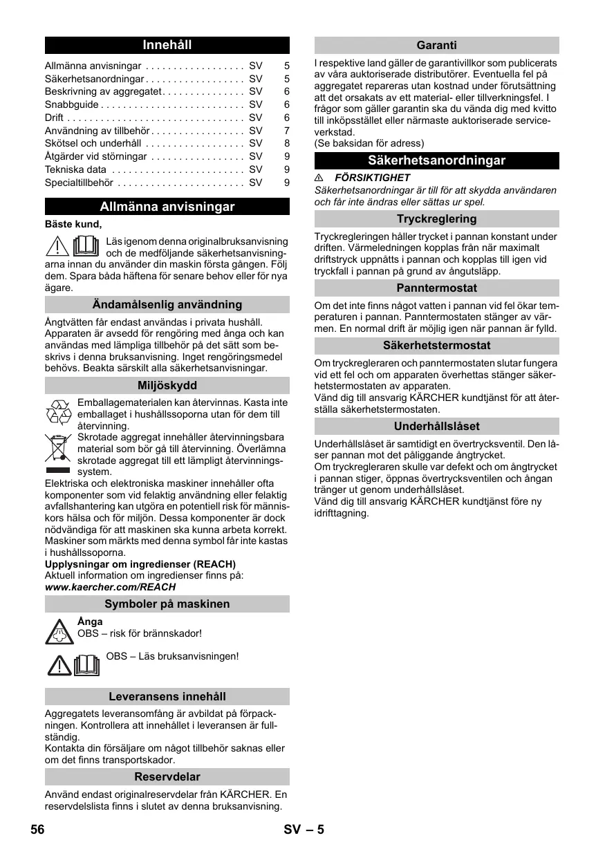 Les matériaux constitutifs de l’emballage sont recyclables. Ne pas jeter les emballages dans les ordures ménagères, mais les remettre à un système de recyclage. Les appareils usés contiennent des matériaux précieux recyclables lesquels doivent être apportés à un système de recyclage. Pour cette raison, utilisez des systèmes de collecte adéquats afin d'éliminer les appareils usés. Les appareils électriques et électroniques renferment souvent des composants qui peuvent représenter un danger potentiel pour l'intégrité physique et l'environnement s'ils sont mal utilisés ou éliminés. Ces composants sont pourtant nécessaires au bon fonctionnement de l'appareil. Les appareils qui présentent ce symbole ne doivent pas être jetés avec les déchets ménagers. Instructions relatives aux ingrédients (REACH) Les informations actuelles relatives aux ingrédients se trouvent sous : www.kaercher.com/REACH Vapeur ATTENTION - Risque de brûlures ATTENTION - Lire les instructions de service !