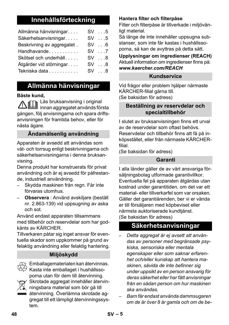 Ändamålsenlig användning Apparaten är avsedd att användas som våt- och torrsug enligt beskrivningarna och säkerhetsanvisningarna i denna bruksanvisning. Denna produkt har konstruerats för privat användning och är ej avsedd för påfrestande, industriell användning. – Skydda maskinen från regn. Får inte förvaras utomhus. – Observera : Använd avskiljare (beställ nr. 2.863-139) vid uppsugning av aska och sot. Använd endast apparaten tillsammans med tillbehör och reservdelar som har godkänts av KÄRCHER. Tillverkaren påtar sig inget ansvar för eventuella skador som uppkommer på grund av felaktig användning eller felaktig hantering.