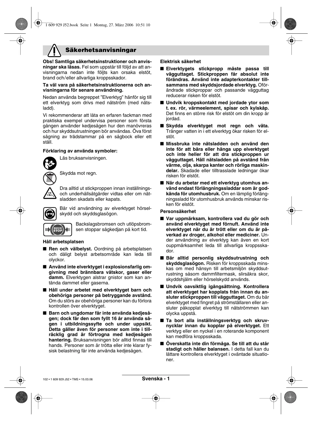 - begränsas av elektroniken ** uppmätt med svärd och kedja Anvisning: Kontrollera maskinens produktnummer på typskylten, handelsbeteckningarna för enskilda maskiner kan variera. Ändamålsenlig användning Leveransen omfattar Sågen är avsedd för sågning i trä som t. ex. träbjälkar, brädor, grenar, stammar osv samt för huggning av träd. Den kan användas för sågning längs och tvärs mot fiberriktningen. Sågen är inte lämplig för sågning av mineraliska material. Inledning I denna instruktionsbok ingår anvisningar för korrekt montering och säker användning av kedjesågen. Läs noggrant dessa anvisningar. 104 • 1 609 929 J52 • TMS • 15.03.06 Maskinens delar ska försiktigt packas upp och kontrolleras att ingenting fattas: – Kedjesåg – Skyddskåpa – Sågkedja – Svärd – Kedjeskydd – Bruksanvisning Saknas delar eller är de skadade ta genast kontakt med din återförsäljare. Svenska - 3 1 609 929 J52.book Seite 4 Montag, 27. März 2006 10:51 10 Maskinens komponenter Säkerhetsåtgärder Numreringen av komponenterna hänvisar till illustration på uppfällbar sida med grafik. Fäll upp sidan med illustration av elverktyget och håll sidan uppfälld när du läser bruksanvisningen. 1 Bakre handtag 2 Inkopplingsspärr 3 Strömställare Till/Från 4 Oljetanklock 5 Kedjebromsutlösning (handskydd) 6 Främre handtag 7 Märkning ”Kedjebromsen fri” 8 Noshjul 9 Kedjeskydd 10 Sågkedja 11 Svärd 12 Tagganslag 13 Kedjespännring, röd 14 Spännvred 15 Skyddskåpa 16 Serienummer 17 Kedjespännkam 18 Fästbult 19 Svärdsgejd 20 Oljemunstycke 21 Löp- och skärriktningssymbol 22 Kedjehjul 23 Kedjefångpinne 24 Oljenivåindikering 25 Återställningsknapp för termoskyddsbrytare 26 Ventilationsöppningar 27 Tillståndsindikering för kastbroms (röd punkt) 28 Dammskyddslock Obs! Innan underhålls- eller rengöringsarbeten utförs, om kabeln kapats, skadats eller trasslat till sig ska kedjesågen frånkopplas och stickproppen dras ur uttaget. Varning! Berör inte roterande kedja. Använd aldrig kedjesågen i närheten av personer, barn eller djur och använd den inte heller under påverkan av alkohol, narkotika eller medikament. Säkert elsystem Din maskin är skyddsisolerad och kräver därför ingen jordning. Driftspänningen är 230 V AC, 50 Hz (för icke EU-länder 220 V, 240 V alltefter utförande). Använd endast godkända förlängningssladdar. Använd endast förlängningssladdar med beteckningen H07-F eller IEC (60227 IEC 53). För drivning av elverktyget får endast förlängningssladdar med följande ledararea användas: – 1,0 mm2: maximal längd 40 m – 1,5 mm2: maximal längd 60 m – 2,5 mm2: maximal längd 100 m För ökad säkerhet rekommenderas montering av en jordfelsbrytare (RCD) med en felström på max. 30 mA används. Denna FI-brytare ska kontrolleras före varje användning. Skarvsladdens kontaktdon måste skyddas mot stänkvatten, vara tillverkat av gummi eller försett med gummiöverdrag. För skarvsladden ska dragavlastning användas. Nätsladden ska regelbundet kontrolleras avseende skador och får användas endast om den är i gott skick. Skadad nätsladd får repareras endast i auktoriserad Bosch-verkstad. I bruksanvisningen avbildat och beskrivet tillbehör ingår inte alltid i leveransen! 105 • 1 609 929 J52 • TMS • 15.03.06 Svenska - 4 1 609 929 J52.book Seite 5 Montag, 27. März 2006 10:51 10