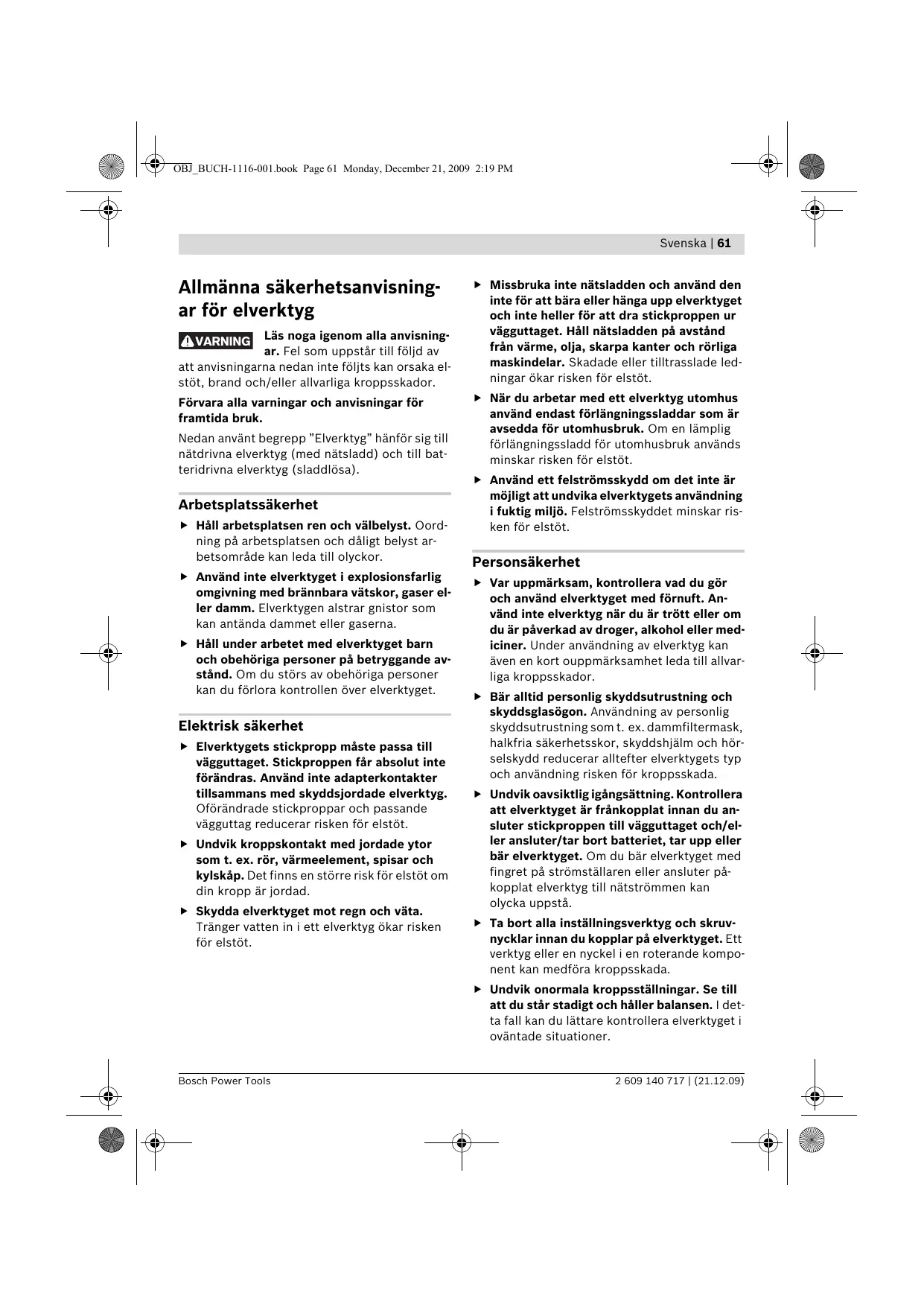 Läs noga igenom alla anvisningar. Fel som uppstår till följd av att anvisningarna nedan inte följts kan orsaka elstöt, brand och/eller allvarliga kroppsskador. VARNING Förvara alla varningar och anvisningar för framtida bruk. Nedan använt begrepp ”Elverktyg” hänför sig till nätdrivna elverktyg (med nätsladd) och till batteridrivna elverktyg (sladdlösa). Arbetsplatssäkerhet f Håll arbetsplatsen ren och välbelyst. Oordning på arbetsplatsen och dåligt belyst arbetsområde kan leda till olyckor. f Använd inte elverktyget i explosionsfarlig omgivning med brännbara vätskor, gaser eller damm. Elverktygen alstrar gnistor som kan antända dammet eller gaserna. f Håll under arbetet med elverktyget barn och obehöriga personer på betryggande avstånd. Om du störs av obehöriga personer kan du förlora kontrollen över elverktyget. Elektrisk säkerhet f Elverktygets stickpropp måste passa till vägguttaget. Stickproppen får absolut inte förändras. Använd inte adapterkontakter tillsammans med skyddsjordade elverktyg. Oförändrade stickproppar och passande vägguttag reducerar risken för elstöt. f Undvik kroppskontakt med jordade ytor som t. ex. rör, värmeelement, spisar och kylskåp. Det finns en större risk för elstöt om din kropp är jordad. f Skydda elverktyget mot regn och väta. Tränger vatten in i ett elverktyg ökar risken för elstöt. f Missbruka inte nätsladden och använd den inte för att bära eller hänga upp elverktyget och inte heller för att dra stickproppen ur vägguttaget. Håll nätsladden på avstånd från värme, olja, skarpa kanter och rörliga maskindelar. Skadade eller tilltrasslade ledningar ökar risken för elstöt. f När du arbetar med ett elverktyg utomhus använd endast förlängningssladdar som är avsedda för utomhusbruk. Om en lämplig förlängningssladd för utomhusbruk används minskar risken för elstöt. f Använd ett felströmsskydd om det inte är möjligt att undvika elverktygets användning i fuktig miljö. Felströmsskyddet minskar risken för elstöt. Personsäkerhet f Var uppmärksam, kontrollera vad du gör och använd elverktyget med förnuft. Använd inte elverktyg när du är trött eller om du är påverkad av droger, alkohol eller mediciner. Under användning av elverktyg kan även en kort ouppmärksamhet leda till allvarliga kroppsskador. f Bär alltid personlig skyddsutrustning och skyddsglasögon. Användning av personlig skyddsutrustning som t. ex. dammfiltermask, halkfria säkerhetsskor, skyddshjälm och hörselskydd reducerar alltefter elverktygets typ och användning risken för kroppsskada. f Undvik oavsiktlig igångsättning. Kontrollera att elverktyget är frånkopplat innan du ansluter stickproppen till vägguttaget och/eller ansluter/tar bort batteriet, tar upp eller bär elverktyget. Om du bär elverktyget med fingret på strömställaren eller ansluter påkopplat elverktyg till nätströmmen kan olycka uppstå. f Ta bort alla inställningsverktyg och skruvnycklar innan du kopplar på elverktyget. Ett verktyg eller en nyckel i en roterande komponent kan medföra kroppsskada. f Undvik onormala kroppsställningar. Se till att du står stadigt och håller balansen. I detta fall kan du lättare kontrollera elverktyget i oväntade situationer. Bosch Power Tools 2 609 140 717 | (21.12.09) OBJ_BUCH-1116-001.book Page 62 Monday, December 21, 2009 2:19 PM 62 | Svenska f Bär lämpliga arbetskläder. Bär inte löst hängande kläder eller smycken. Håll håret, kläderna och handskarna på avstånd från rörliga delar. Löst hängande kläder, långt hår och smycken kan dras in av roterande delar. f Vid elverktyg med dammutsugnings- och -uppsamlingsutrustning, se till att denna är rätt monterade och används på korrekt sätt. Användning av dammutsugning minskar de risker damm orsakar. Korrekt användning och hantering av elverktyg f Överbelasta inte elverktyget. Använd för aktuellt arbete avsett elverktyg. Med ett lämpligt elverktyg kan du arbeta bättre och säkrare inom angivet effektområde. f Ett elverktyg med defekt strömställare får inte längre användas. Ett elverktyg som inte kan kopplas in eller ur är farligt och måste repareras. f Dra stickproppen ur vägguttaget och/eller ta bort batteriet innan inställningar utförs, tillbehörsdelar byts ut eller elverktyget lagras. Denna skyddsåtgärd förhindrar oavsiktlig inkoppling av elverktyget. f Förvara elverktygen oåtkomliga för barn. Låt elverktyget inte användas av personer som inte är förtrogna med dess användning eller inte läst denna anvisning. Elverktygen är farliga om de används av oerfarna personer. f Sköt elverktyget omsorgsfullt. Kontrollera att rörliga komponenter fungerar felfritt och inte kärvar, att komponenter inte brustit eller skadats; orsaker som kan leda till att elverktygets funktioner påverkas menligt. Låt skadade delar repareras innan elverktyget tas i bruk. Många olyckor orsakas av dåligt skötta elverktyg. f Håll skärverktygen skarpa och rena. Omsorgsfullt skötta skärverktyg med skarpa eggar kommer inte så lätt i kläm och går lättare att styra. 2 609 140 717 | (21.12.09) f Använd elverktyget, tillbehör, insatsverktyg osv. enligt dessa anvisningar. Ta hänsyn till arbetsvillkoren och arbetsmomenten. Om elverktyget används på ett sätt som det inte är avsett för kan farliga situationer uppstå. Omsorgsfull hantering och användning av sladdlösa elverktyg f Ladda batterierna endast i de laddare som tillverkaren rekommenderat. Om en laddare som är avsedd för en viss typ av batterier används för andra batterityper finns risk för brand. f Använd endast batterier som är avsedda för aktuellt elverktyg. Används andra batterier finns risk för kroppsskada och brand. f Håll gem, mynt, nycklar, spikar, skruvar och andra små metallföremål på avstånd från reservbatterier för att undvika en bygling av kontakterna. En kortslutning av batteriets kontakter kan leda till 
