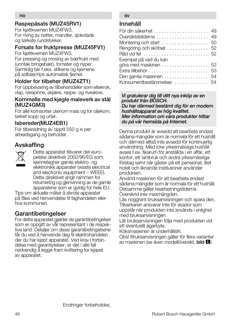 sá=Öê~íìäÉê~ê=ÇáÖ=íáää=Çáíí=åó~=áåâ∏é=~î=Éå= éêçÇìâí=Ñê™å=_lp`eK aì=Ü~ê=Ç®êãÉÇ=ÄÉëí®ãí=ÇáÖ=Ñ∏ê=Éå=ãçÇÉêå= ÜìëÜ™ääë~éé~ê~í=~î=Ü∏Ö=âî~äáíÉíK jÉê=áåÑçêã~íáçå=çã=î™ê~=éêçÇìâíÉê=Üáíí~ê= Çì=é™=î™ê=ÜÉãëáÇ~=é™=fåíÉêåÉíK Denna produkt är avsedd att bearbeta endast sådana mängder som är normala för ett hushåll och därmed alltså inte avsedd för kontinuerlig användning. Med icke yrkesmässiga hushåll avses t.ex. fikarum för anställda i en affär, ett kontor, ett lantbruk och andra yrkesmässiga företag samt när gäster på ett pensionat, litet hotell och liknande institutioner använder produkten. Använd maskinen för att bearbeta endast sådana mängder som är normala för ett hushåll. Detsamma gäller bearbetningstiderna. Överskrid inte maxmängden. Läs noggrant bruksanvisningen och spara den. Tillverkaren ansvarar inte för skador som uppstår när produkten inte används i enlighet med bruksanvisningen. Låt bruksanvisningen följa med produkten vid ett eventuellt ägarbyte. Köksmaskinen är underhållsfri. Obs! Bruksanvisningen gäller för flera varianter av maskinen (se även modellöversikt, bild ). Endringer forbeholdes.