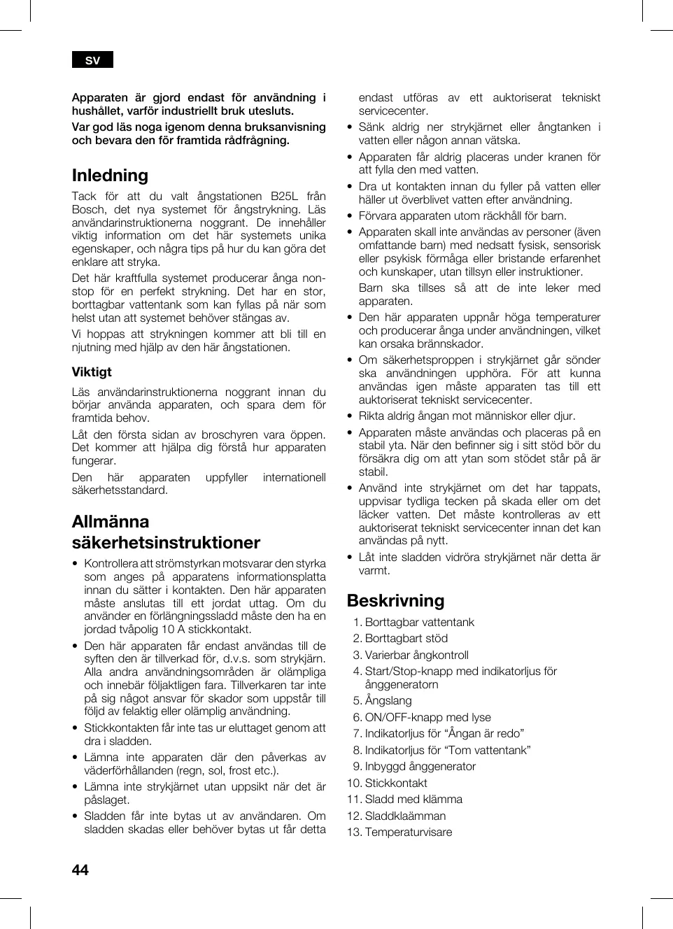 Inledning Tack för att du valt ångstationen B25L från Bosch, det nya systemet för ångstrykning. Läs användarinstruktionerna noggrant. De innehåller viktig information om det här systemets unika egenskaper, och några tips på hur du kan göra det enklare att stryka. Det här kraftfulla systemet producerar ånga nonstop för en perfekt strykning. Det har en stor, borttagbar vattentank som kan fyllas på när som helst utan att systemet behöver stängas av. Vi hoppas att strykningen kommer att bli till en njutning med hjälp av den här ångstationen. Viktigt Läs användarinstruktionerna noggrant innan du börjar använda apparaten, och spara dem för framtida behov. Låt den första sidan av broschyren vara öppen. Det kommer att hjälpa dig förstå hur apparaten fungerar. Den här apparaten uppfyller internationell säkerhetsstandard. Allmänna säkerhetsinstruktioner