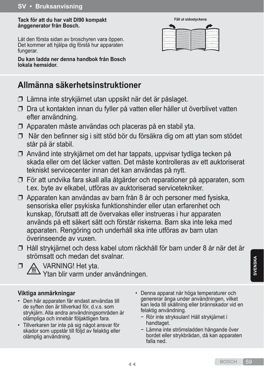 SV • Bruksanvisning Tack för att du har valt DI90 kompakt ånggenerator från Bosch.