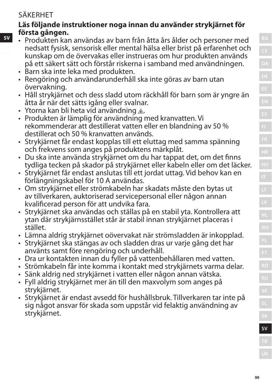 Säkerhet Läs följande instruktioner noga innan du använder strykjärnet för första gången. • Produkten kan användas av barn från åtta års ålder och personer med nedsatt fysisk, sensorisk eller mental hälsa eller brist på erfarenhet och kunskap om de övervakas eller instrueras om hur produkten används på ett säkert sätt och förstår riskerna i samband med användningen. • Barn ska inte leka med produkten. • Rengöring och användarunderhåll ska inte göras av barn utan övervakning. • Håll strykjärnet och dess sladd utom räckhåll för barn som är yngre än åtta år när det sätts igång eller svalnar. • Ytorna kan bli heta vid användning . • Produkten är lämplig för användning med kranvatten. Vi rekommenderar att destillerat vatten eller en blandning av 50 % destillerat och 50 % kranvatten används. • Strykjärnet får endast kopplas till ett eluttag med samma spänning och frekvens som anges på produktens märkplåt. • Du ska inte använda strykjärnet om du har tappat det, om det finns tydliga tecken på skador på strykjärnet eller kabeln eller om det läcker. • Strykjärnet får endast anslutas till ett jordat uttag. Vid behov kan en förlängningskabel för 10 A användas. • Om strykjärnet eller strömkabeln har skadats måste den bytas ut av tillverkaren, auktoriserad servicepersonal eller någon annan kvalificerad person för att undvika fara. • Strykjärnet ska användas och ställas på en stabil yta. Kontrollera att ytan där strykjärnsstället står är stabil innan strykjärnet placeras i stället. • Lämna aldrig strykjärnet oövervakat när strömsladden är inkopplad. • Strykjärnet ska stängas av och sladden dras ur varje gång det har använts samt före rengöring och underhåll. • Dra ur kontakten innan du fyller på vattenbehållaren med vatten. • Strömkabeln får inte komma i kontakt med strykjärnets varma delar. • Sänk aldrig ned strykjärnet i vatten eller någon annan vätska. • Fyll aldrig strykjärnet mer än till den maxvolym som anges på strykjärnet. • Strykjärnet är endast avsedd för hushållsbruk. Tillverkaren tar inte på sig något ansvar för skada som uppstår vid felaktig användning av strykjärnet.