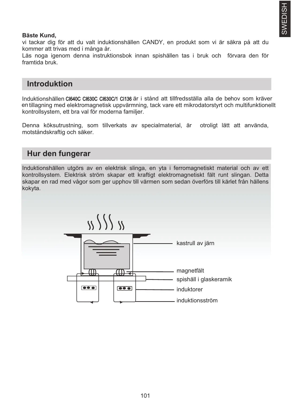 Introduktion Induktionshällen CI640C CI630C CI630C/1 CI136 är i stånd att tillfredsställa alla de behov som kräver en tillagning med elektromagnetisk uppvärmning, tack vare ett mikrodatorstyrt och multifunktionellt kontrollsystem, ett bra val för moderna familjer. Denna köksutrustning, som tillverkats av specialmaterial, är motståndskraftig och säker. otroligt lätt att använda, Hur den fungerar Induktionshällen utgörs av en elektrisk slinga, en yta i ferromagnetiskt material och av ett kontrollsystem. Elektrisk ström skapar ett kraftigt elektromagnetiskt fält runt slingan. Detta skapar en rad med vågor som ger upphov till värmen som sedan överförs till kärlet från hällens kokyta. kastrull av järn magnetfält spishäll i glaskeramik induktorer induktionsström