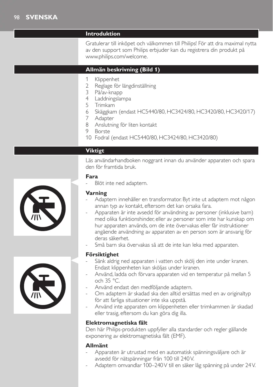 Den har Philips-produkten uppfyller alla standarder och regler gällande exponering av elektromagnetiska falt (EMF).