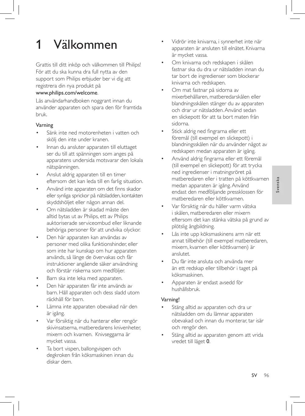 Varning • Sänk inte ned motorenheten i vatten och skölj den inte under kranen. • Innan du ansluter apparaten till eluttaget ser du till att spänningen som anges på apparatens undersida motsvarar den lokala nätspänningen. • Anslut aldrig apparaten till en timer eftersom det kan leda till en farlig situation. • Använd inte apparaten om det finns skador eller synliga sprickor på nätsladden, kontakten skyddshöljet eller någon annan del. • Om nätsladden är skadad måste den alltid bytas ut av Philips, ett av Philips auktoriserade serviceombud eller liknande behöriga personer för att undvika olyckor. • Den här apparaten kan användas av personer med olika funktionshinder, eller som inte har kunskap om hur apparaten används, så länge de övervakas och får instruktioner angående säker användning och förstår riskerna som medföljer. • Barn ska inte leka med apparaten. • Den här apparaten får inte används av barn. Håll apparaten och dess sladd utom räckhåll för barn. • Lämna inte apparaten obevakad när den är igång. • Var försiktig när du hanterar eller rengör skivinsatserna, matberedarens knivenheter, mixern och kvarnen. Knivseggarna är mycket vassa. • Ta bort vispen, ballongvispen och degkroken från köksmaskinen innan du diskar dem.