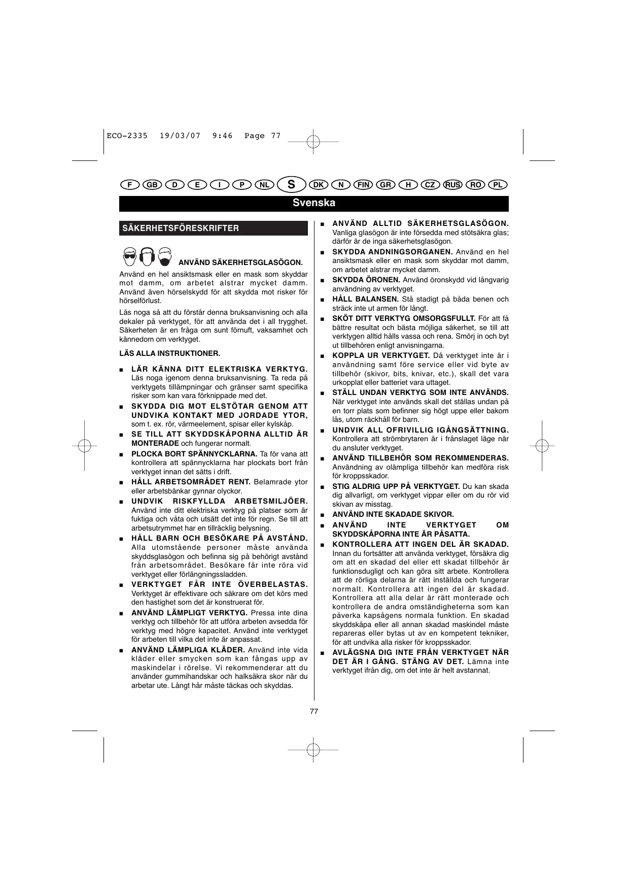 ANVÄND ALLTID SÄKERHETSGLASÖGON. Vanliga glasögon är inte försedda med stötsäkra glas; därför är de inga säkerhetsglasögon. SKYDDA ANDNINGSORGANEN. Använd en hel ansiktsmask eller en mask som skyddar mot damm, om arbetet alstrar mycket damm. SKYDDA ÖRONEN. Använd öronskydd vid långvarig användning av verktyget. HÅLL BALANSEN. Stå stadigt på båda benen och sträck inte ut armen för långt. SKÖT DITT VERKTYG OMSORGSFULLT. För att få bättre resultat och bästa möjliga säkerhet, se till att verktygen alltid hålls vassa och rena. Smörj in och byt ut tillbehören enligt anvisningarna. KOPPLA UR VERKTYGET. Då verktyget inte är i användning samt före service eller vid byte av tillbehör (skivor, bits, knivar, etc.), skall det vara urkopplat eller batteriet vara uttaget. STÄLL UNDAN VERKTYG SOM INTE ANVÄNDS. När verktyget inte används skall det ställas undan på en torr plats som befinner sig högt uppe eller bakom lås, utom räckhåll för barn. UNDVIK ALL OFRIVILLIG IGÅNGSÄTTNING. Kontrollera att strömbrytaren är i frånslaget läge när du ansluter verktyget. ANVÄND TILLBEHÖR SOM REKOMMENDERAS. Användning av olämpliga tillbehör kan medföra risk för kroppsskador. STIG ALDRIG UPP PÅ VERKTYGET. Du kan skada dig allvarligt, om verktyget vippar eller om du rör vid skivan av misstag. ANVÄND INTE SKADADE SKIVOR. ANVÄND INTE VERKTYGET SKYDDSKÅPORNA INTE ÄR PÅSATTA. KONTROLLERA ATT INGEN DEL ÄR SKADAD. Innan du fortsätter att använda verktyget, försäkra dig om att en skadad del eller ett skadat tillbehör är funktionsdugligt och kan göra sitt arbete. Kontrollera att de rörliga delarna är rätt inställda och fungerar normalt. Kontrollera att ingen del är skadad. Kontrollera att alla delar är rätt monterade och kontrollera de andra omständigheterna som kan påverka kapsågens normala funktion. En skadad skyddskåpa eller all annan skadad maskindel måste repareras eller bytas ut av en kompetent tekniker, för att undvika alla risker för kroppsskador. AVLÄGSNA DIG INTE FRÅN VERKTYGET NÄR DET ÄR I GÅNG. STÄNG AV DET. Lämna inte verktyget ifrån dig, om det inte är helt avstannat. ECO-2335