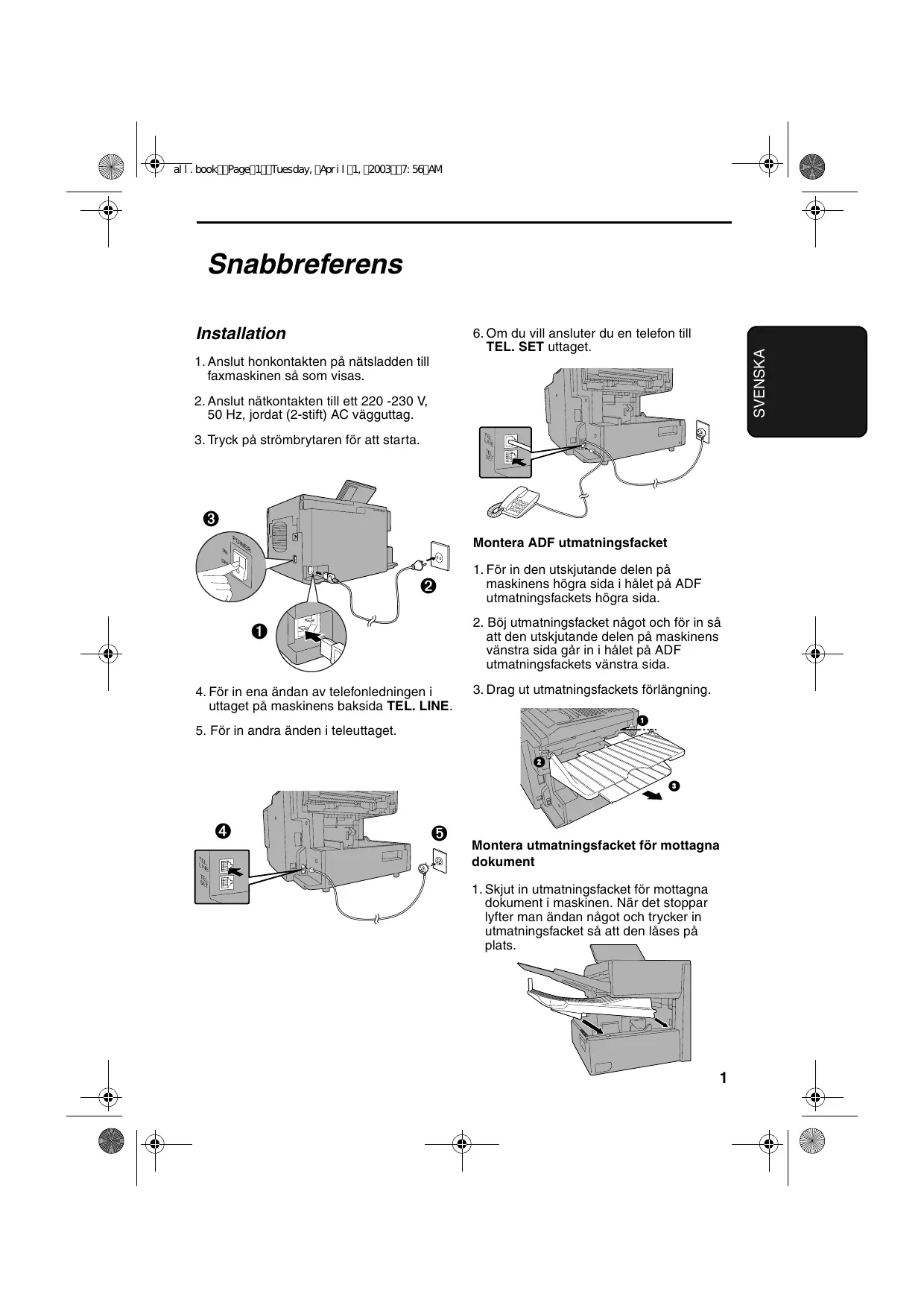 Montera utmatningsfacket fôr mottagna dokument -SKjut in utmatningsfacket fôr mottagna dokument i maskinen. När det stoppar lYfter man ändan nâgot och trycker in utmatningsfacket sà att den lâses pà plats.