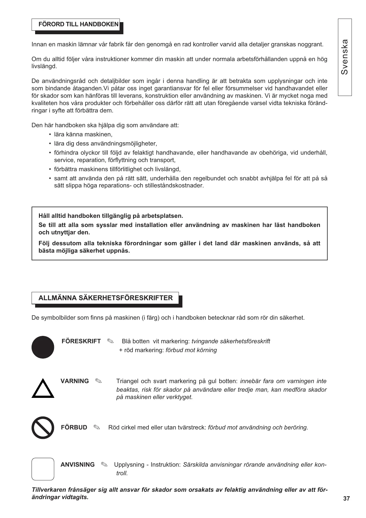 De symbolbilder som finns på maskinen (i färg) och i handboken betecknar råd som rör din säkerhet. FÖRESKRIFTxx✎ xxBlå botten vit markering: tvingande säkerhetsföreskrift FÖRESKRIFTxx✎xx+ röd markering: förbud mot körning VARNINGxx✎ Triangel och svart markering på gul botten: innebär fara om varningen inte beaktas, risk för skador på användare eller tredje man, kan medföra skador på maskinen eller verktyget. FÖRBUDxx✎ xx Röd cirkel med eller utan tvärstreck: förbud mot användning och beröring. ANVISNINGxx✎ xxUpplysning - Instruktion: Särskilda anvisningar rörande användning eller kontroll. Tillverkaren frånsäger sig allt ansvar för skador som orsakats av felaktig användning eller av att förändringar vidtagits.
