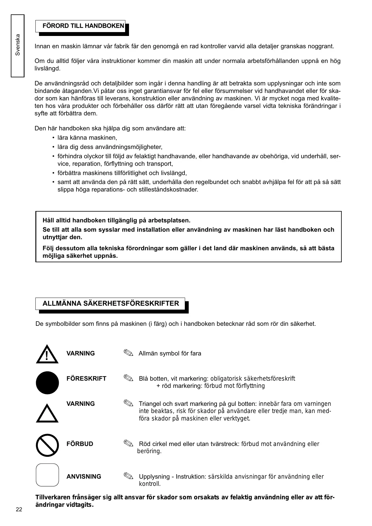 L'emploi de pictogrammes sur les machines (en couleur) et dans le manuel indiqueront des conseils qui concernent votre sécurité.