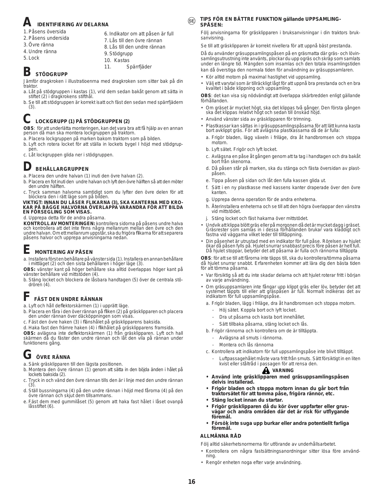 PRUDENCE: Ne laissez pas de feuilles dans les récipients du bac de ramassage. Videz les récipients après l’usage et avant de ranger le bac de ramassage. En ne le faisant pas vous vous exposez à un risque de combustion spontanée susceptible de provoquer un incendie.