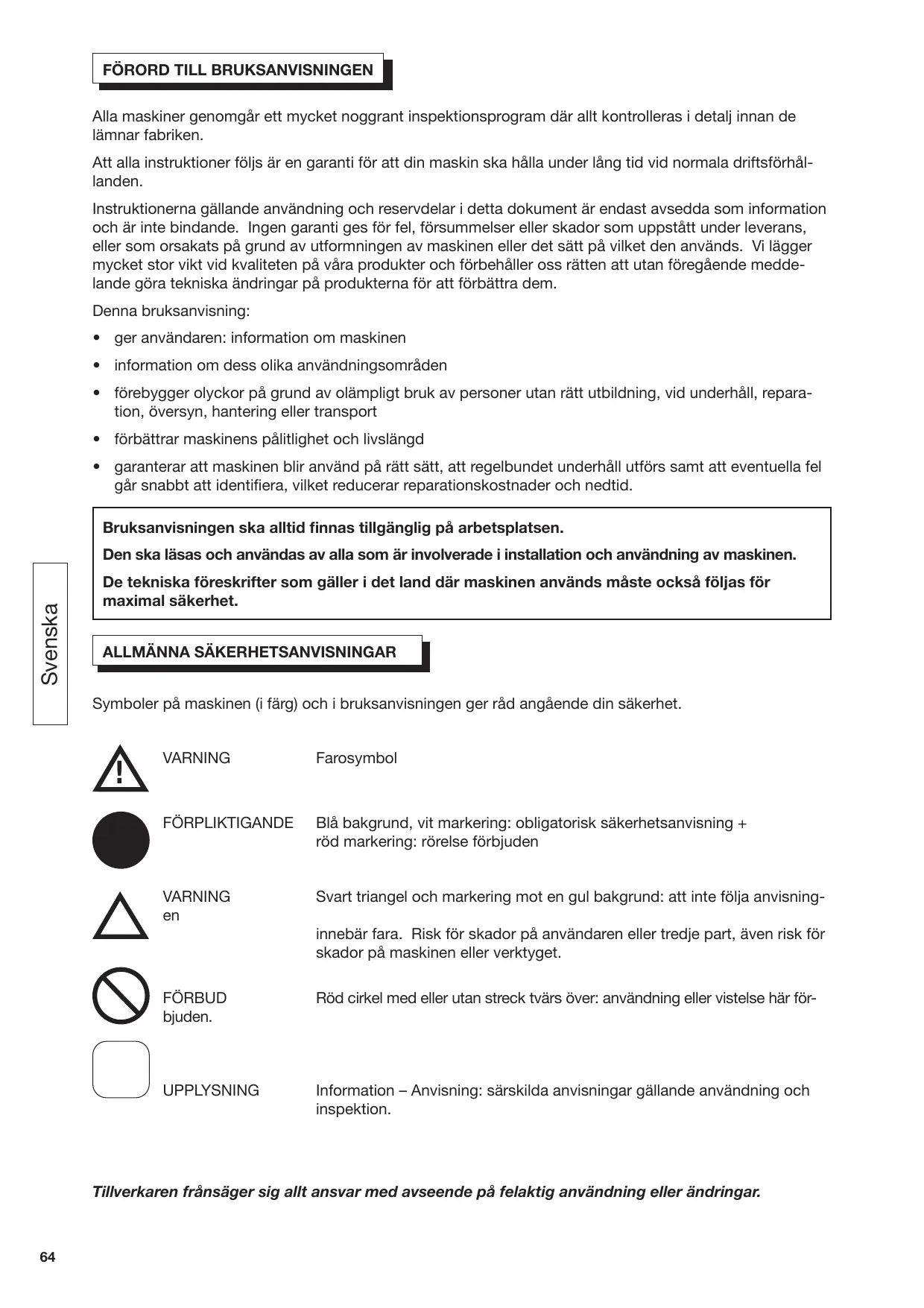 Symboler pâ maskinen (i färg) och i bruksanvisningen ger râd angäende din säkerhet. VARNING Farosymbol FÔRPLIKTIGANDE Blà bakgrund, vit markering: obligatorisk säkerhetsanvisning + rôd markering: rôrelse fôrbjuden VARNING Svart triangel och markering mot en gul bakgrund: att inte fôlja anvisning- innebär fara. Risk fôr skador pâ användaren eller tredje part, även risk fôr skador pà maskinen eller verktyget. POLA FÔRBUD Rôd cirkel med eller utan streck tvärs ôver: användning eller vistelse här fôr- bjuden. UPPLYSNING Information — Anvisning: särskilda anvisningar gällande användning och inspektion. Tillverkaren frânsäger sig allt ansvar med avseende pä felaktig användning eller ändringar.